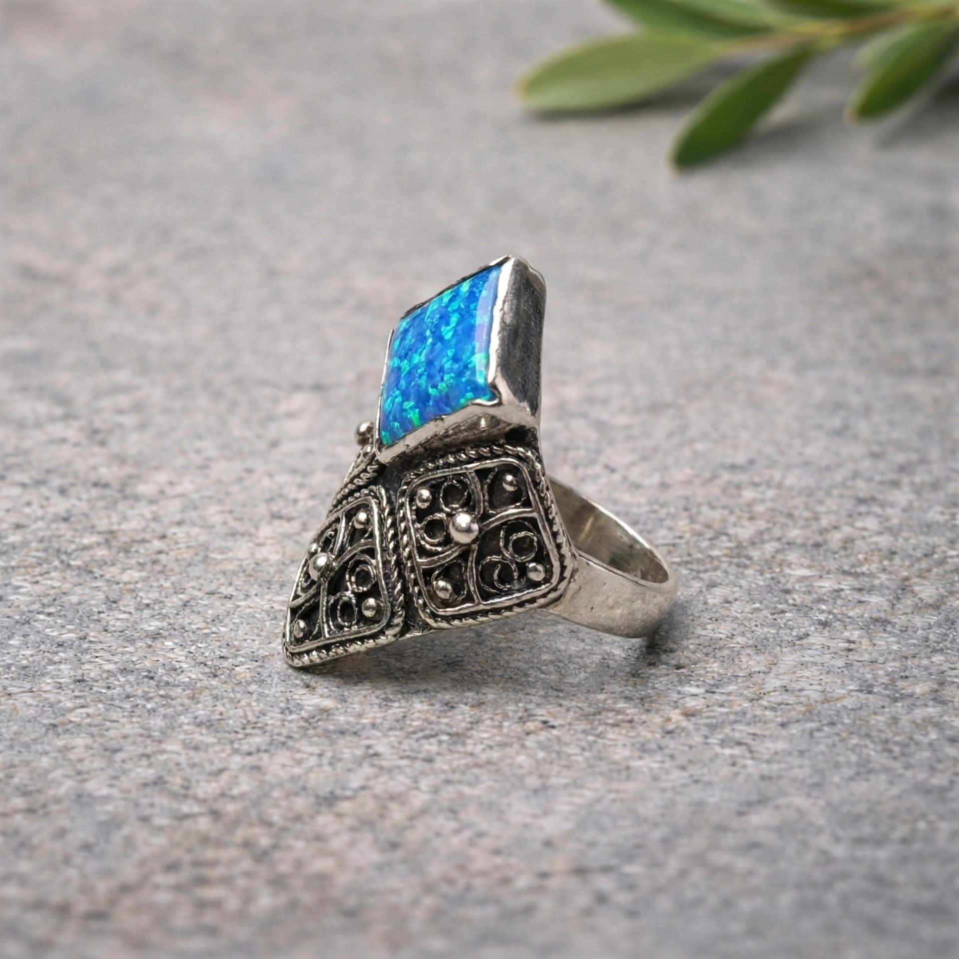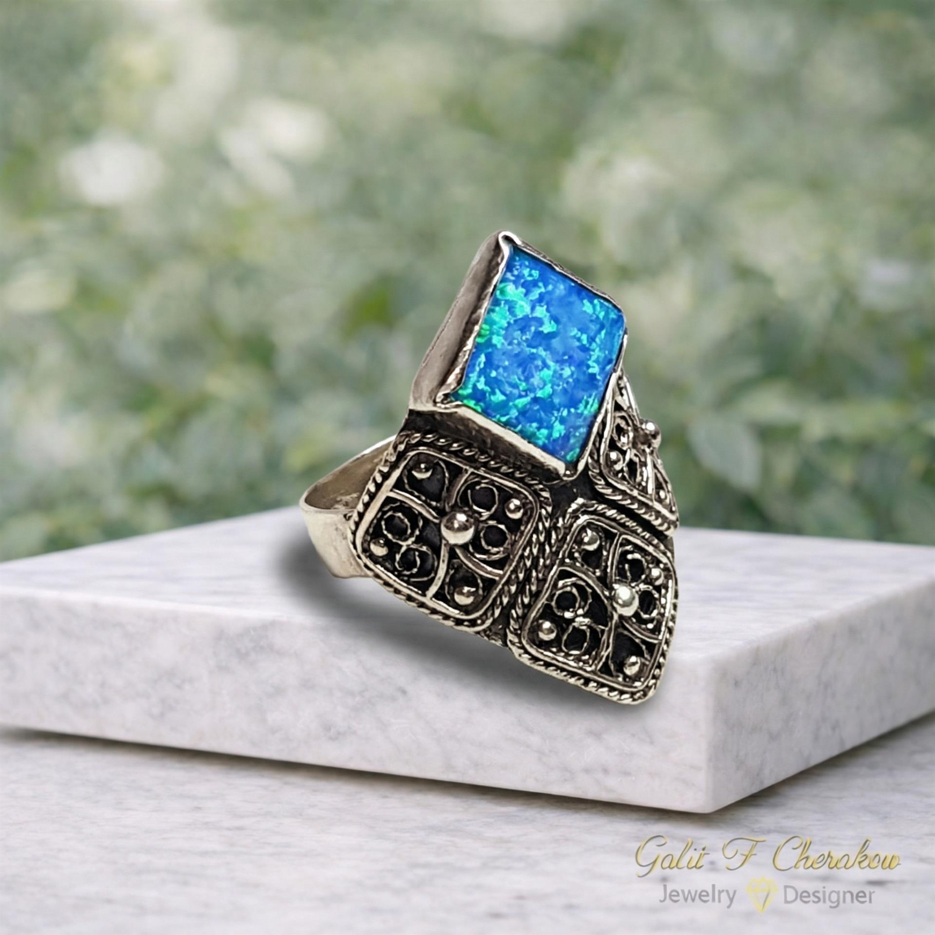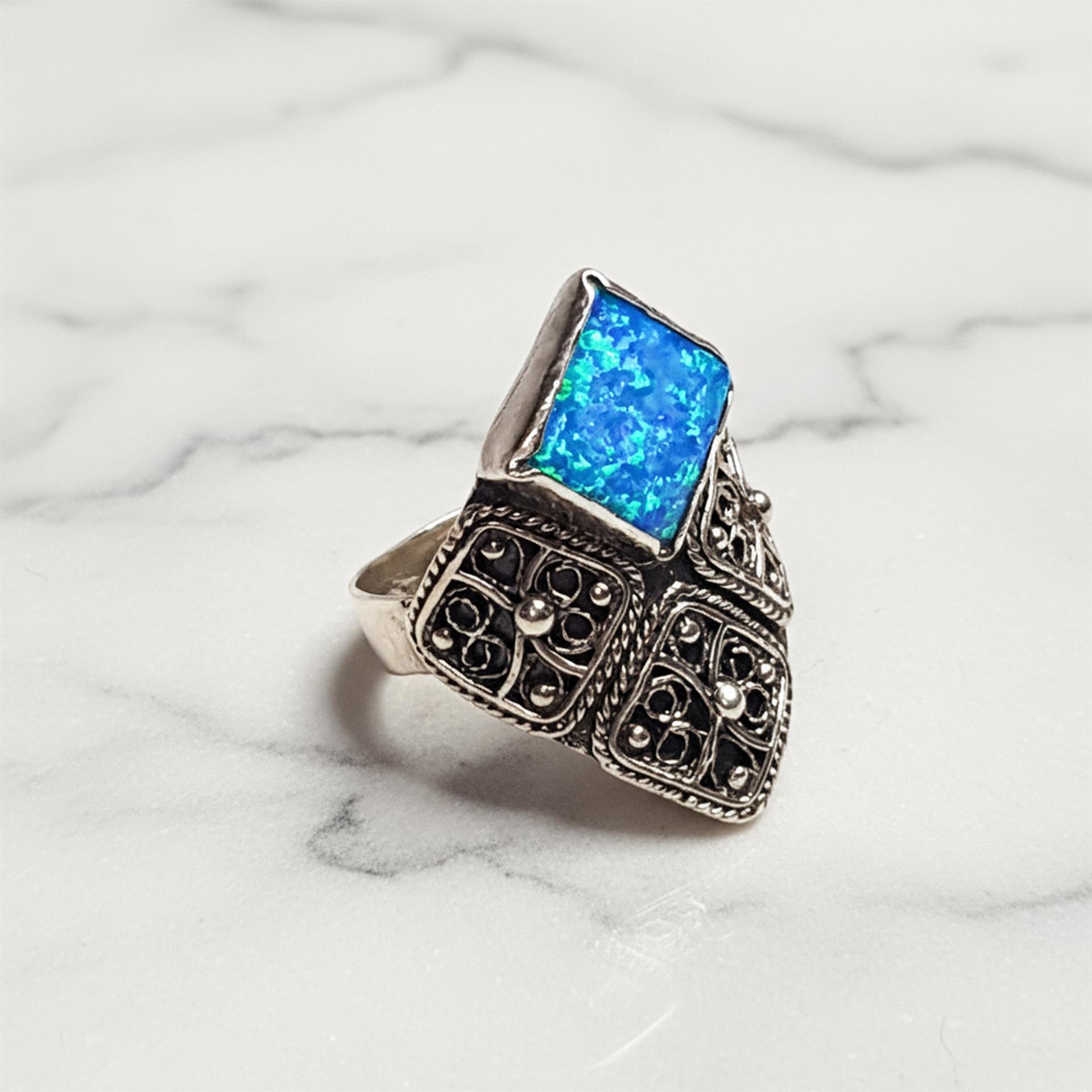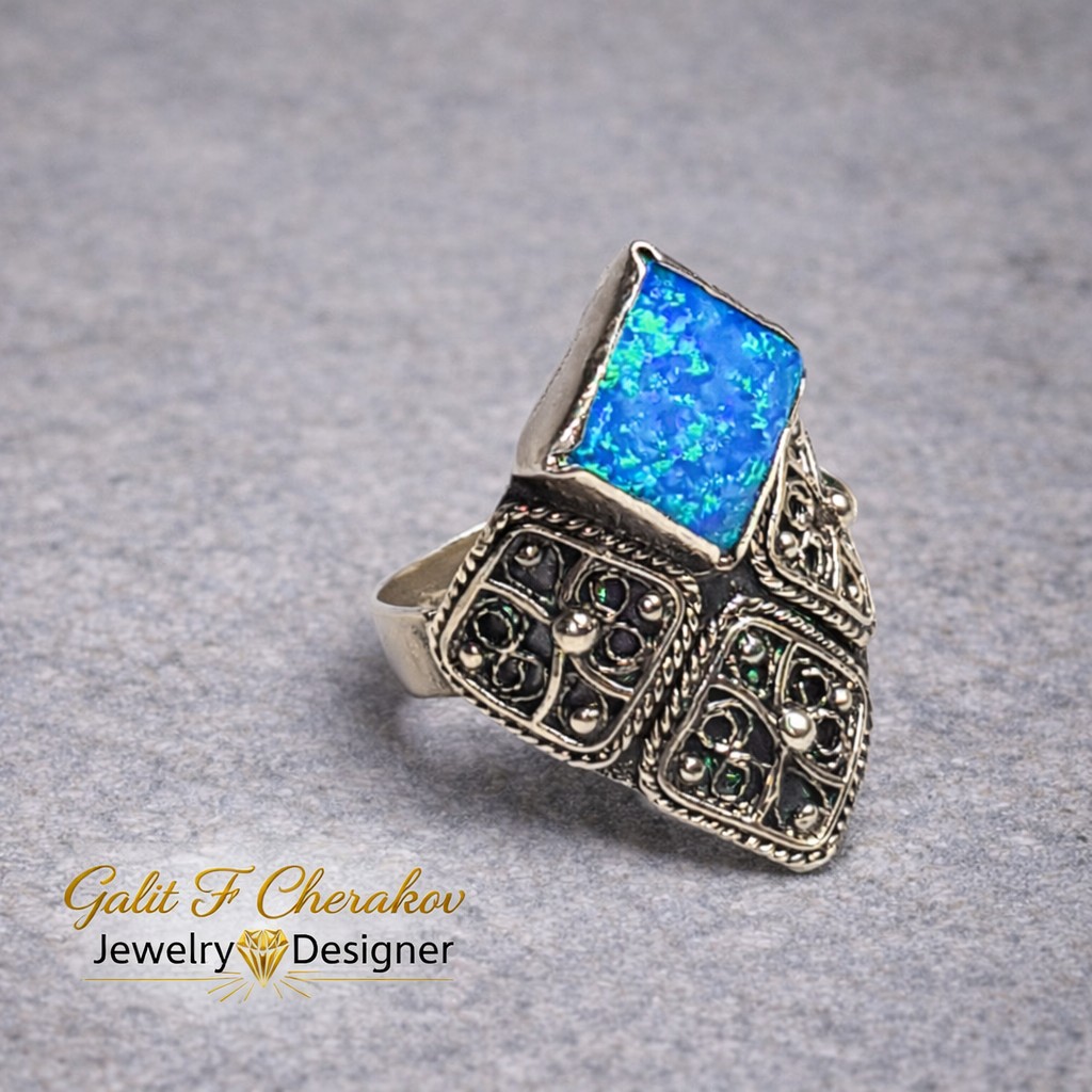 טבעת כסף 925 מעויין ואבן אופל תכלת היא תכשיט מהמם ומיוחד המשלב בתוכו את סגנון התימני המסורתי והאופנתי ביותר. עשויה מכסף 925, הטבעת מעניקה מראה מודרני ומלא ניצנוץ. השילוב הייחודי של עיצוב מעויין ואבן אופל תכלת מעניק לטבעת מראה מרהיב ומקורי. הפיליגרן המדהים המשלב פיתוחים עדינים ומורכבים משדרג את המראה הסופי שלה. טבעת זו היא פריט מושלם לשדרג כל לוק ולהוסיף נוכחות ויוקרה ליד היד. הטבעת מגיעה במידות שונות ומתאימה לכל אישה שמעוניינת להתפאר עם תכשיט מיוחד ואיכותי. כל תכשיט מגיע באריזת מתנה מהודרת ומוכן להפתעה ולהופיע כמתנה מושלמת ליקירי הלב. תפני את המבט של כל מי שסביבך והוסיפי ניצנוץ וקסם ליום יומך עם טבעת כסף 925 מעויין ואבן אופל תכלת.