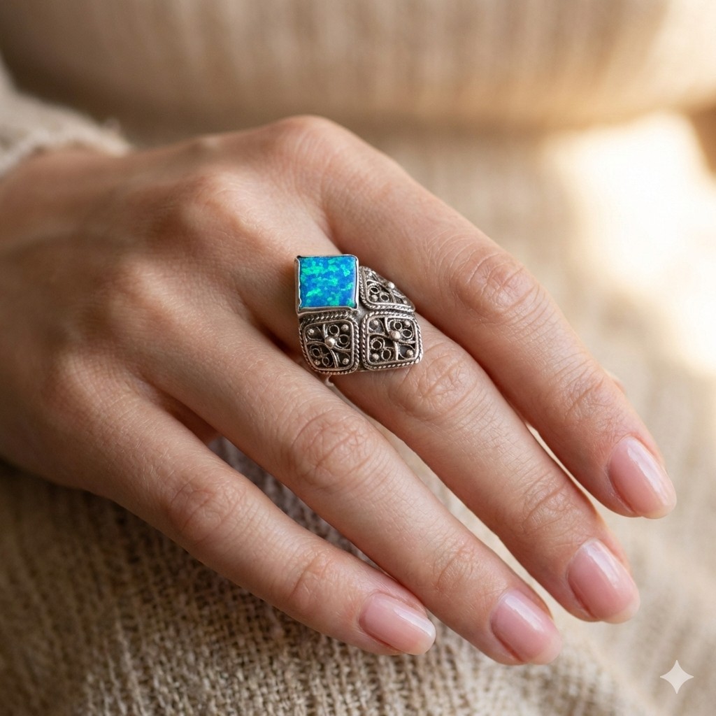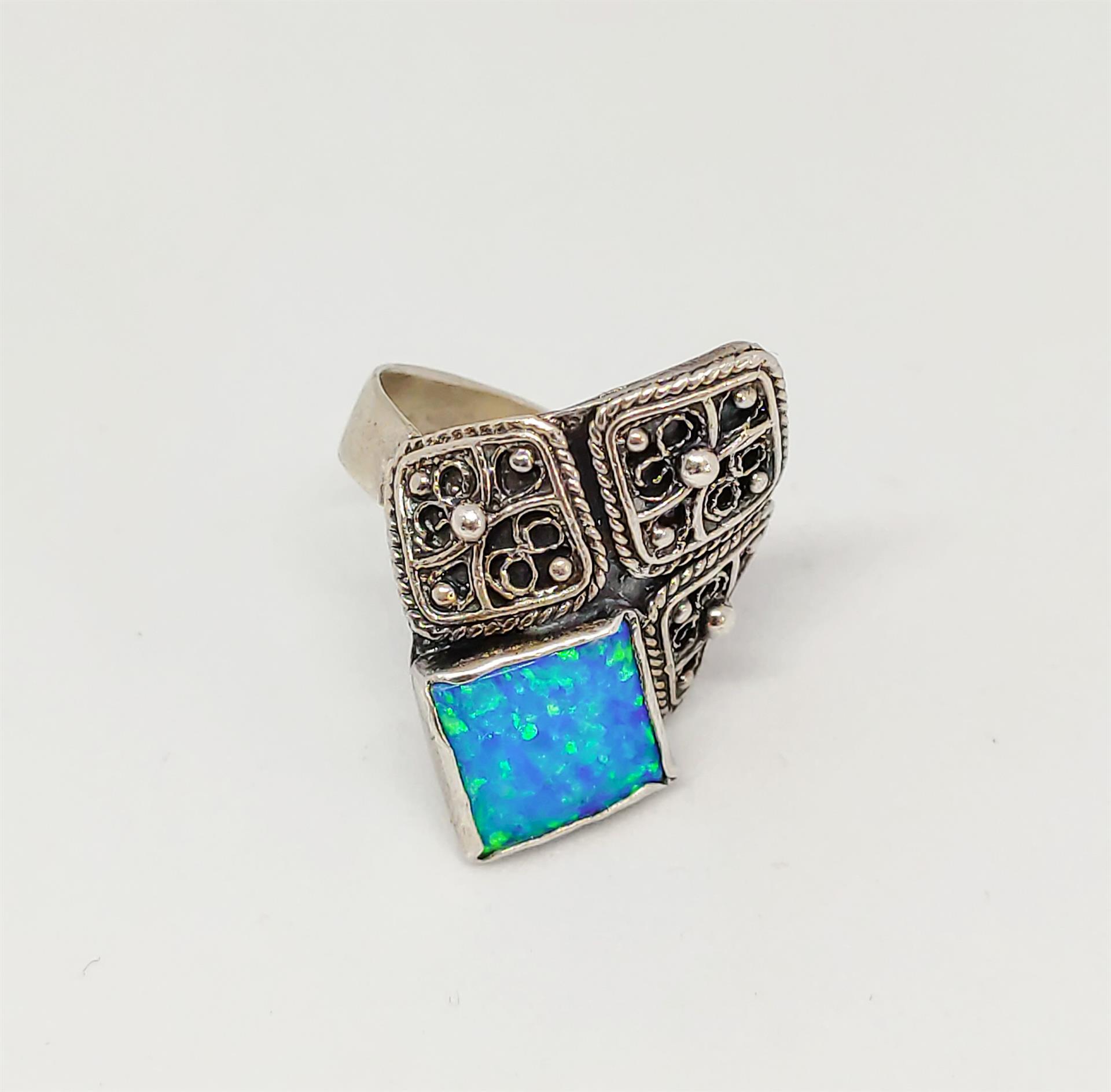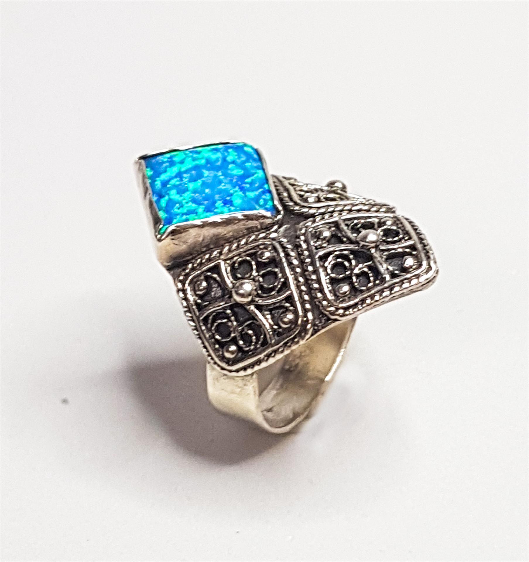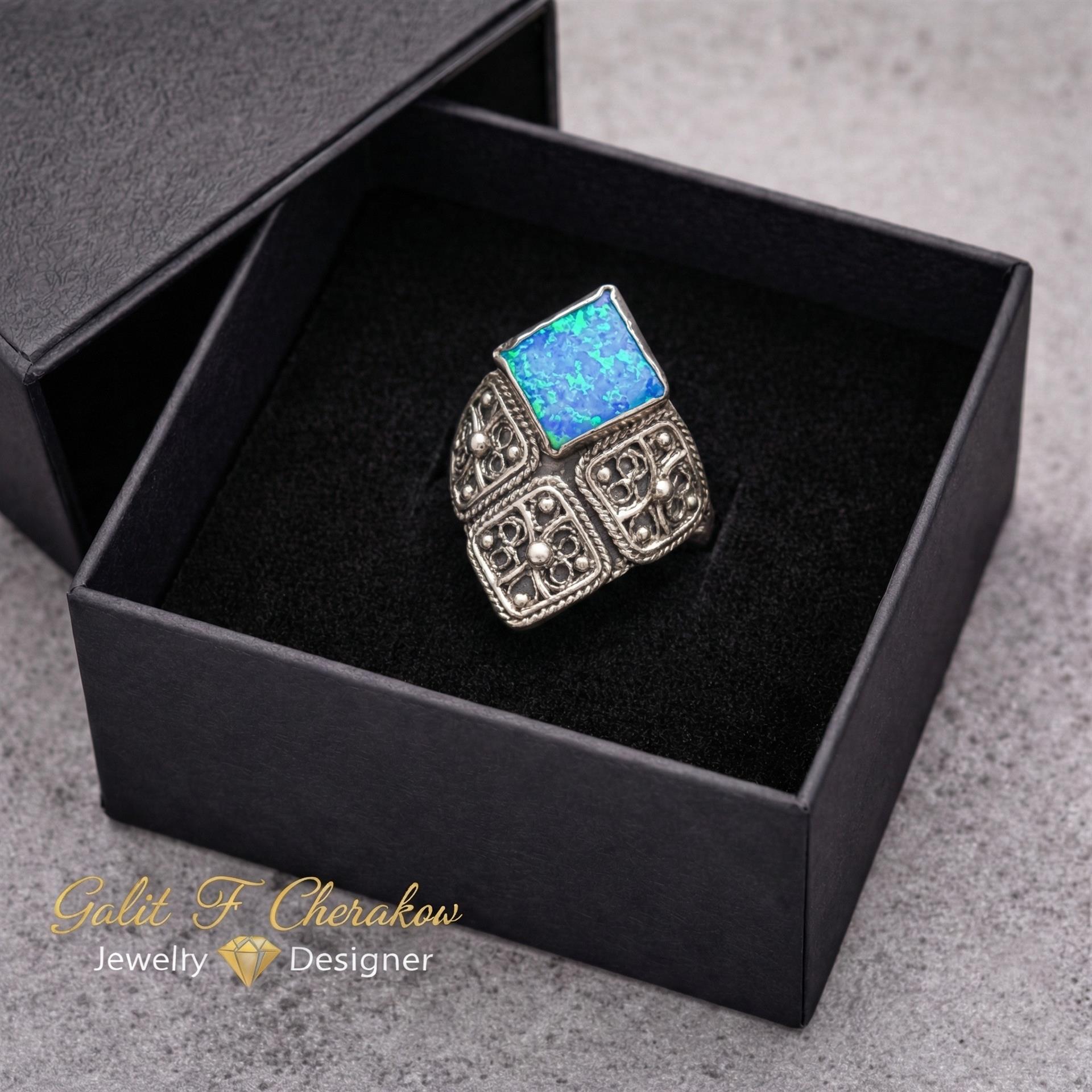 טבעת כסף 925 מעויין ואבן אופל תכלת היא תכשיט מהמם ומיוחד המשלב בתוכו את סגנון התימני המסורתי והאופנתי ביותר. עשויה מכסף 925, הטבעת מעניקה מראה מודרני ומלא ניצנוץ. השילוב הייחודי של עיצוב מעויין ואבן אופל תכלת מעניק לטבעת מראה מרהיב ומקורי. הפיליגרן המדהים המשלב פיתוחים עדינים ומורכבים משדרג את המראה הסופי שלה. טבעת זו היא פריט מושלם לשדרג כל לוק ולהוסיף נוכחות ויוקרה ליד היד. הטבעת מגיעה במידות שונות ומתאימה לכל אישה שמעוניינת להתפאר עם תכשיט מיוחד ואיכותי. כל תכשיט מגיע באריזת מתנה מהודרת ומוכן להפתעה ולהופיע כמתנה מושלמת ליקירי הלב. תפני את המבט של כל מי שסביבך והוסיפי ניצנוץ וקסם ליום יומך עם טבעת כסף 925 מעויין ואבן אופל תכלת.