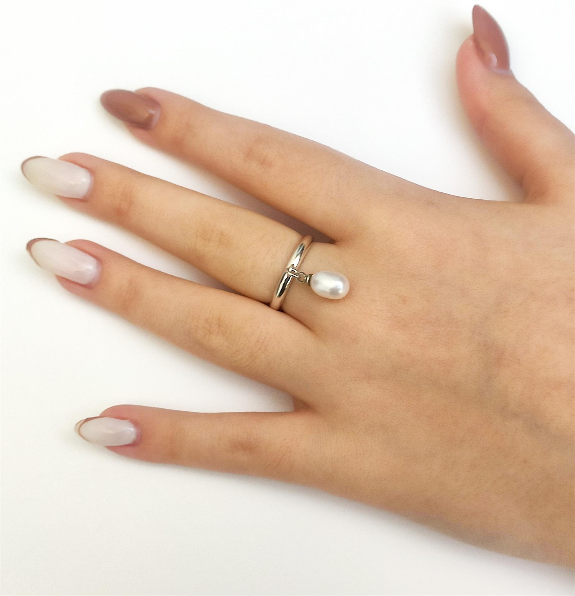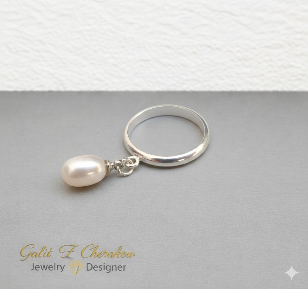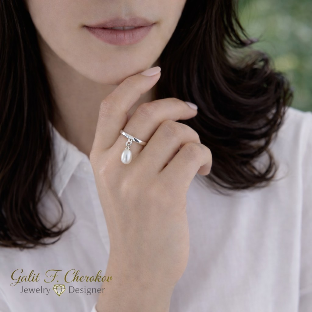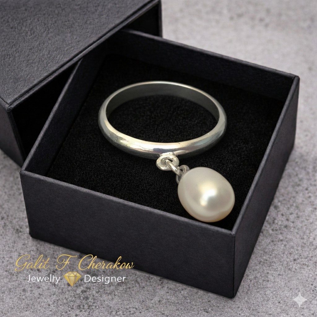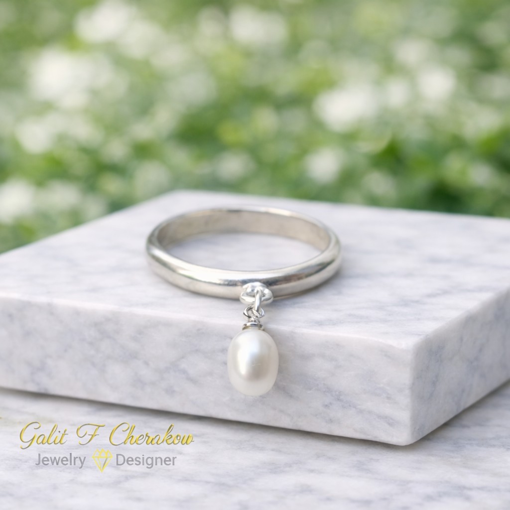 טבעת כסף עדינה ומינימליסטית בעבודת יד, מעוצבת בקו נקי ואלגנטי עם פנינה טבעית מתנדנדת שמוסיפה תנועה עדינה וברק טבעי.