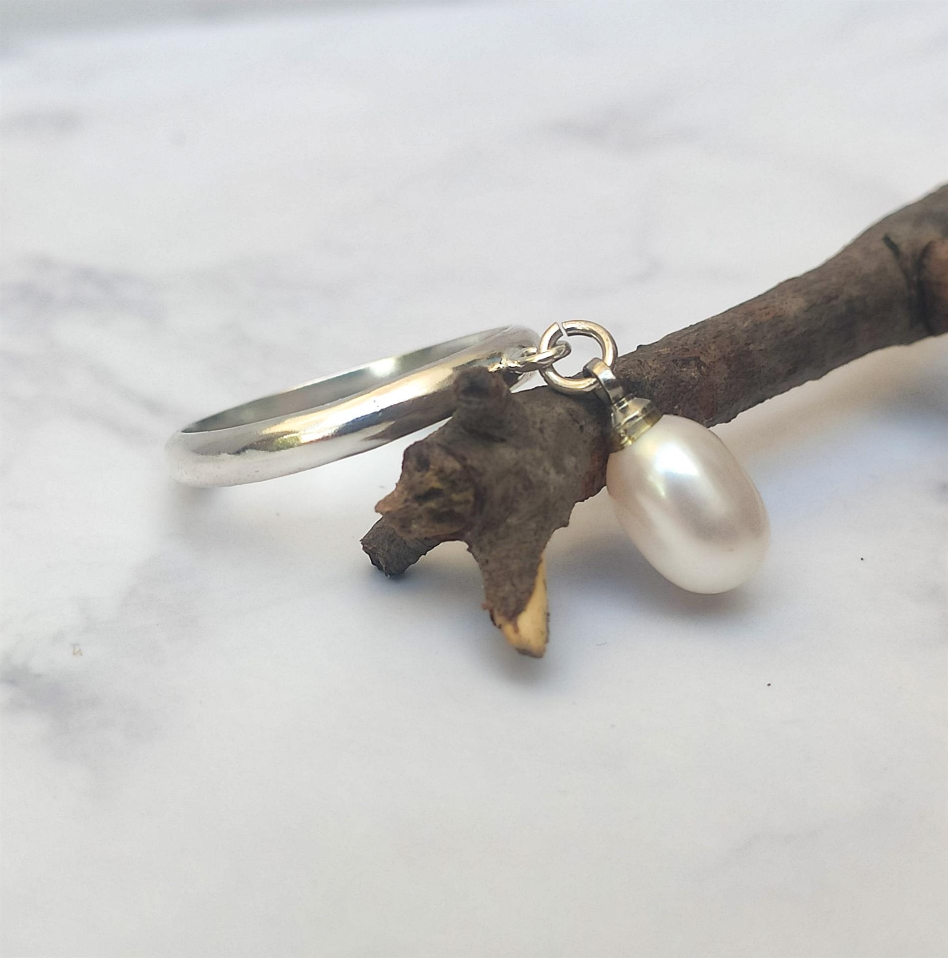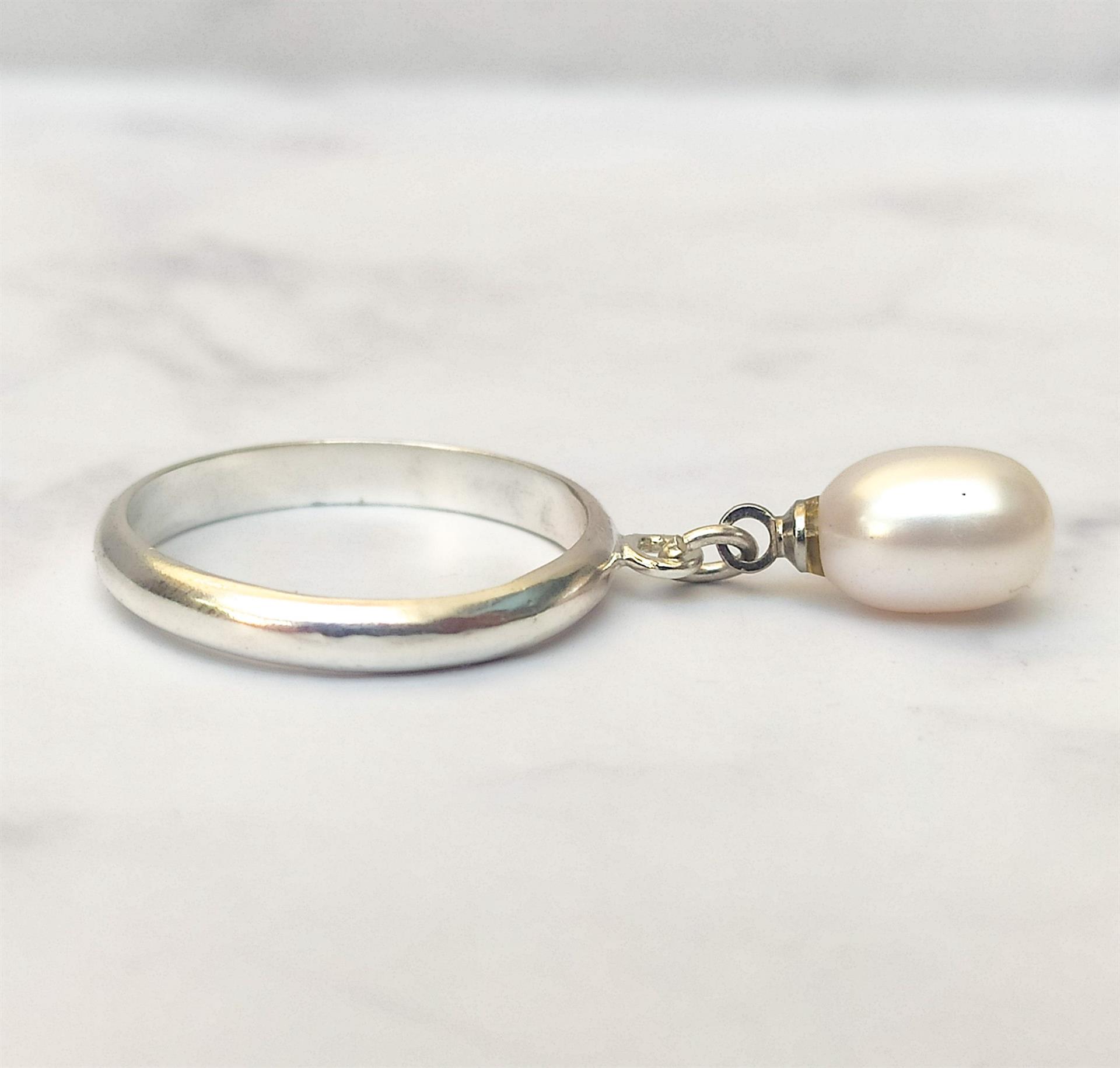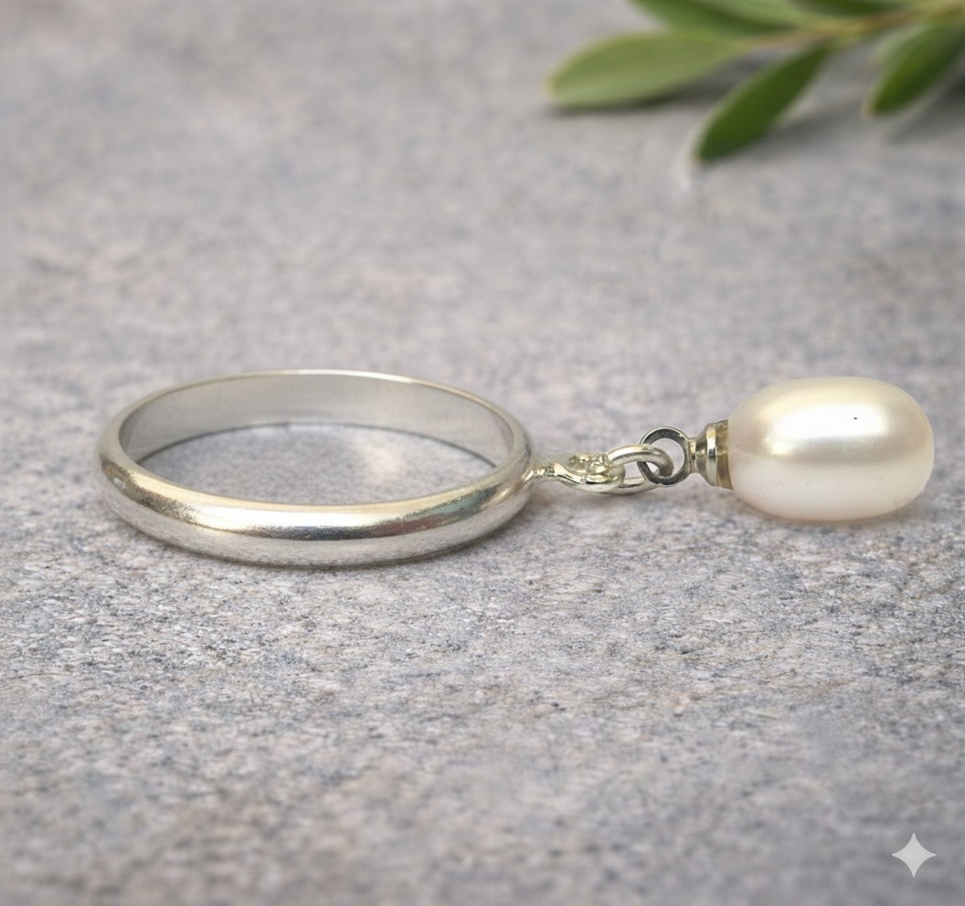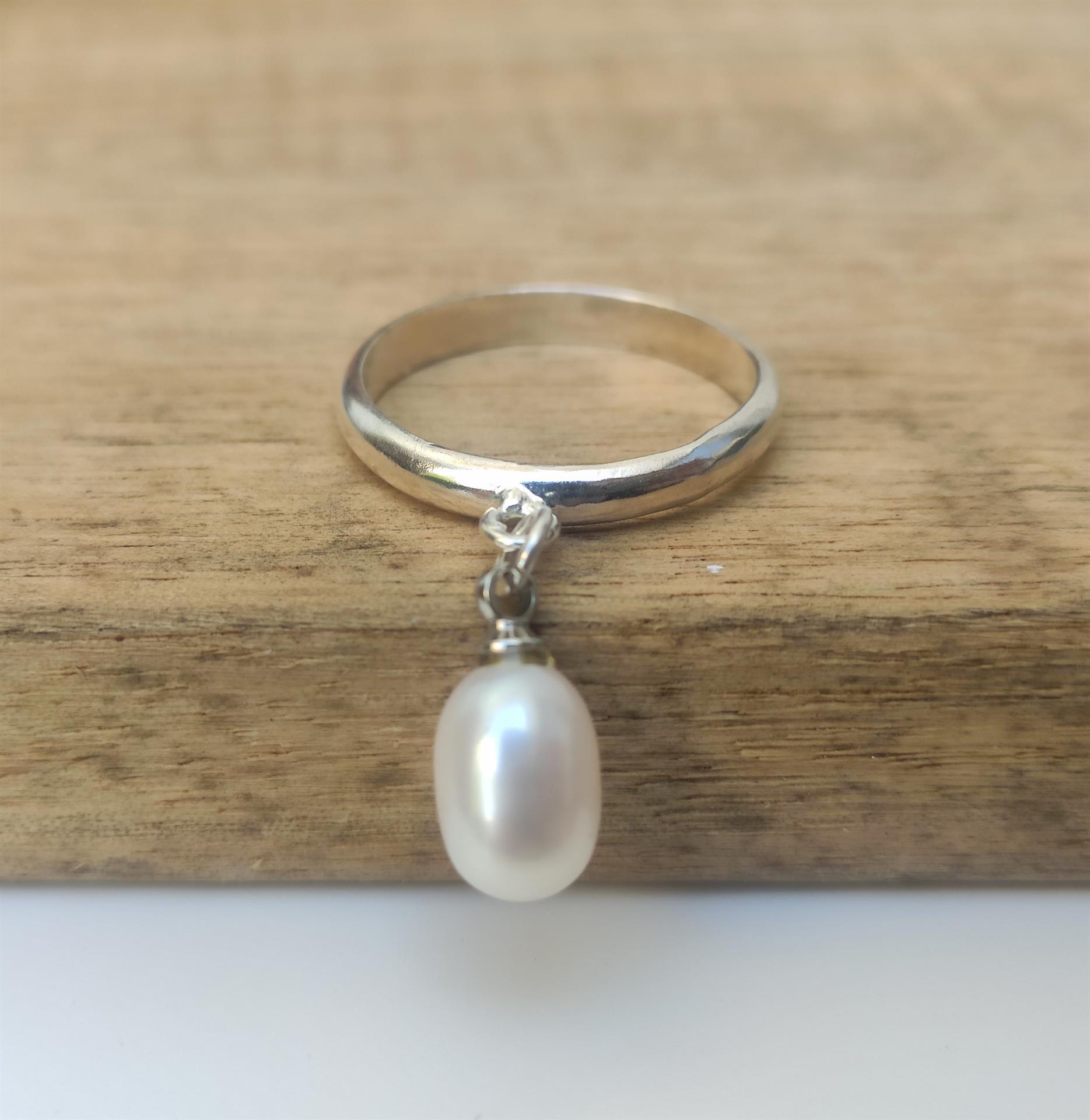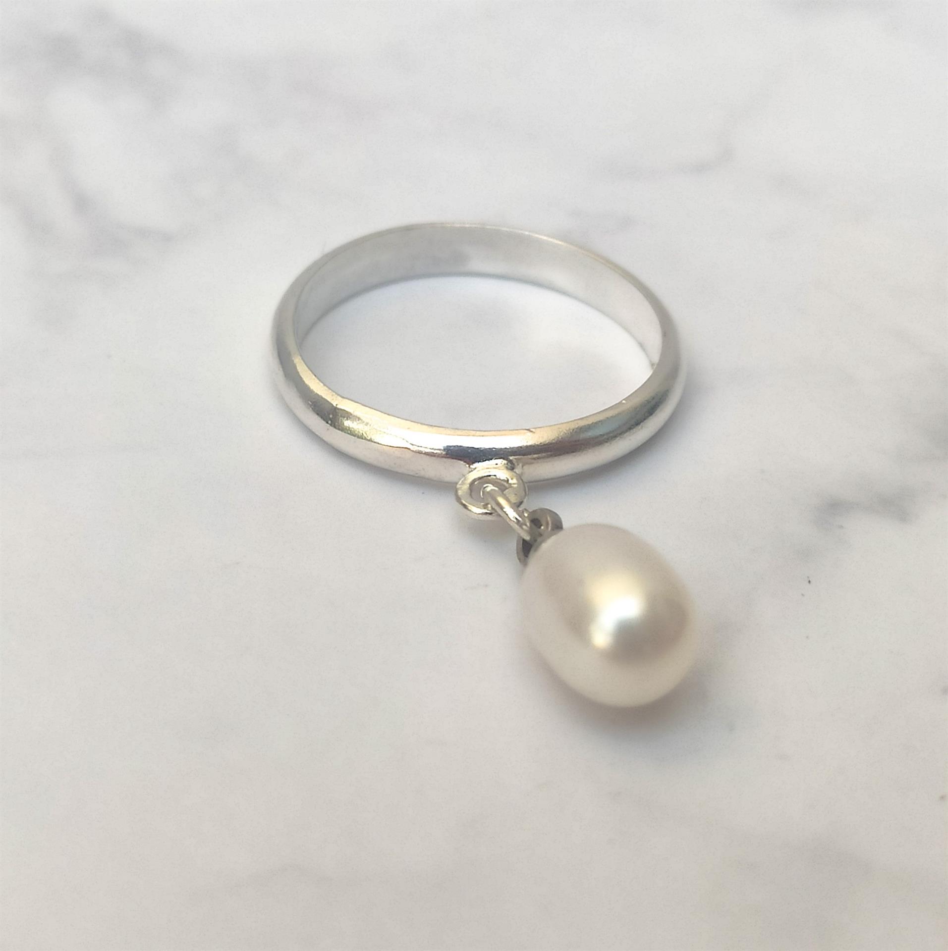 טבעת כסף עדינה ומינימליסטית בעבודת יד, מעוצבת בקו נקי ואלגנטי עם פנינה טבעית מתנדנדת שמוסיפה תנועה עדינה וברק טבעי.