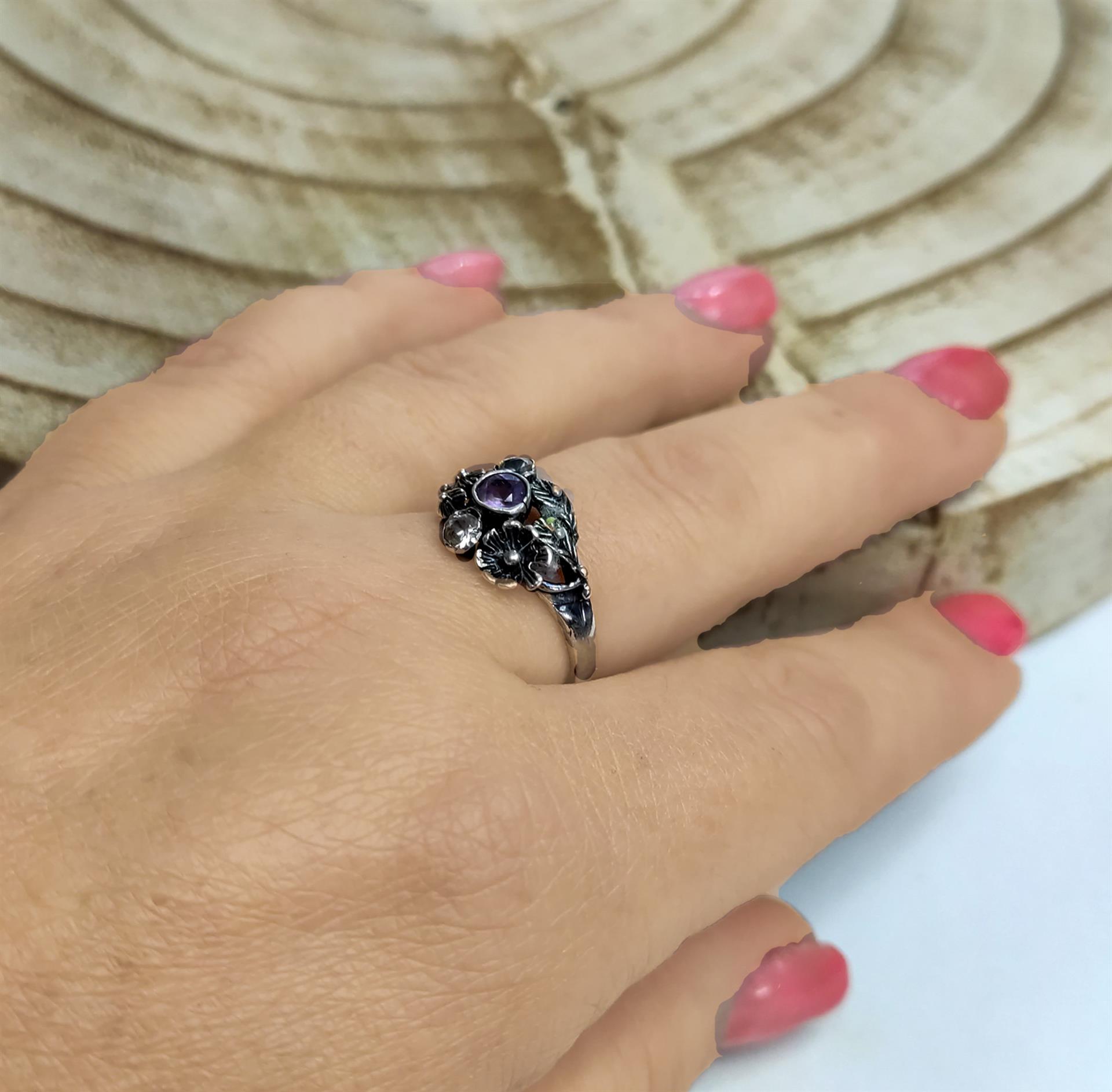 הטבעת עשויה מכסף סטרלינג 925 איכותי, ומעוטרת בעיצוב פרחוני מפורט שיוצר מראה עדין ואלגנטי. כל עלי הכותרת והפרטים הקטנים של הפרח עוצבו בקפידה, ויוצרים מראה תלת ממדי ומרשים. במרכז הפרח שובצו אבני זירקון זעירות ונוצצות, המוסיפות ברק וזוהר לטבעת.