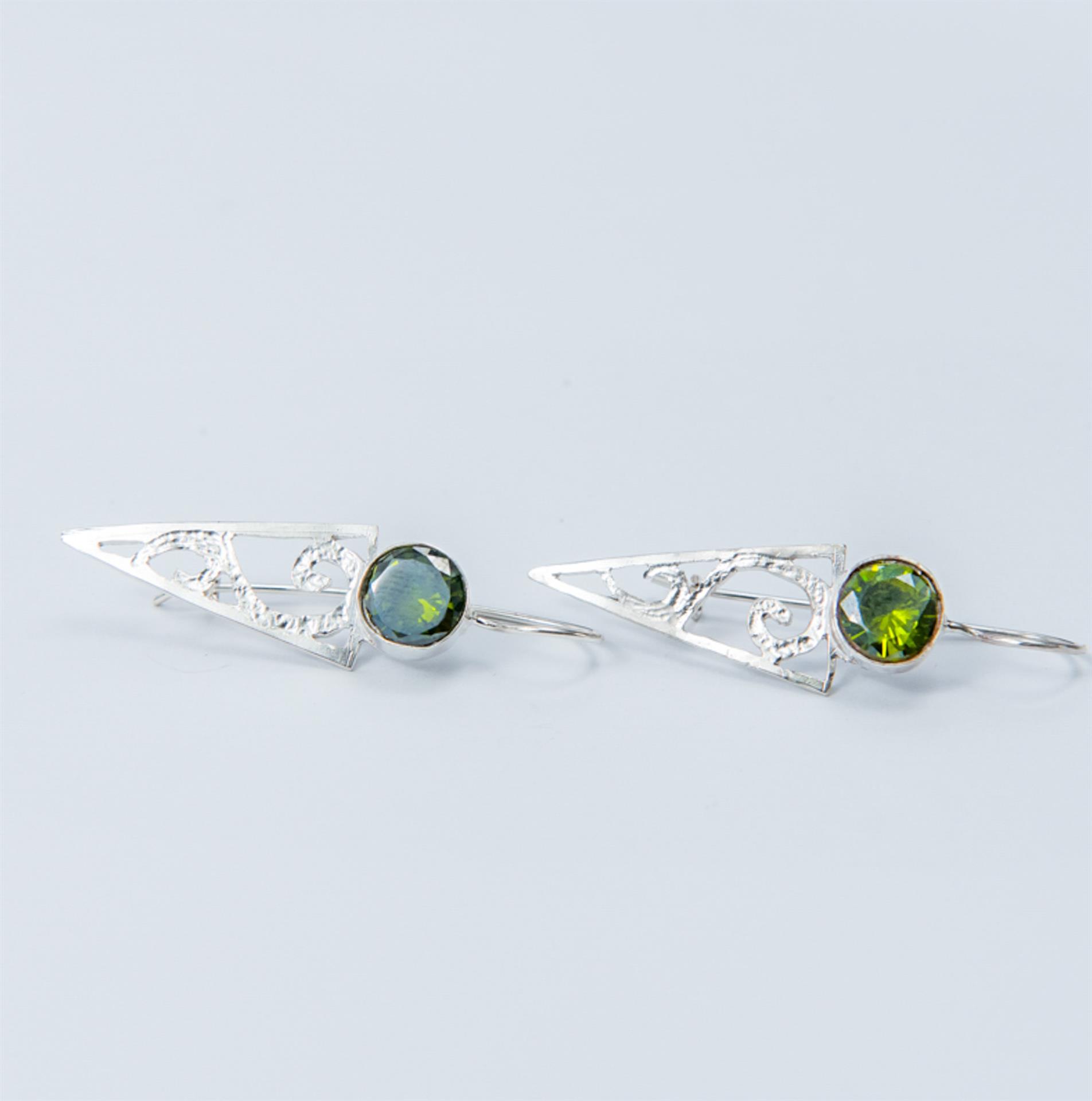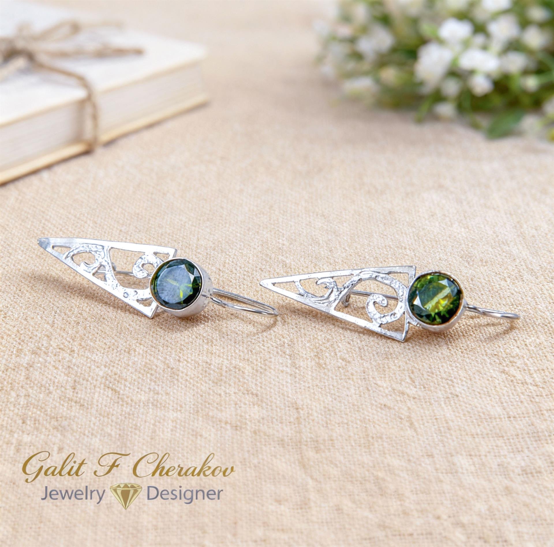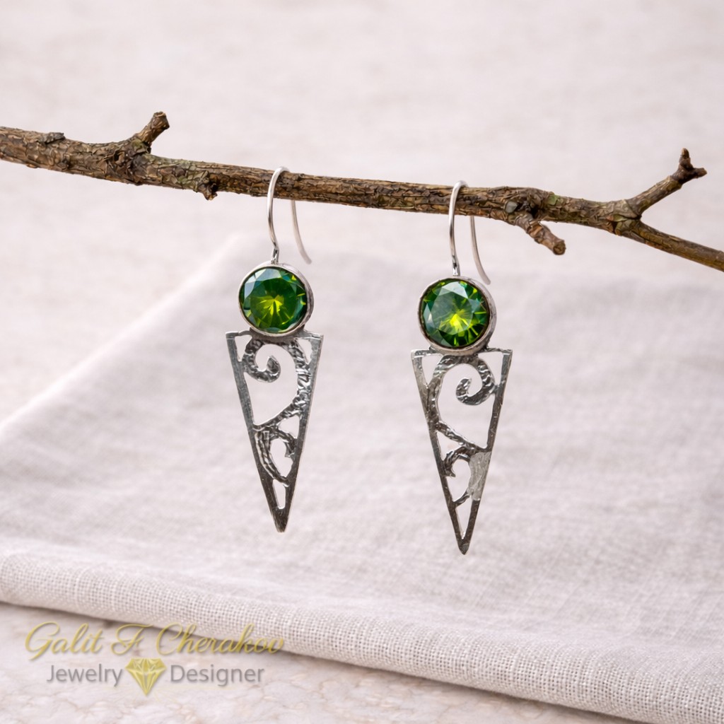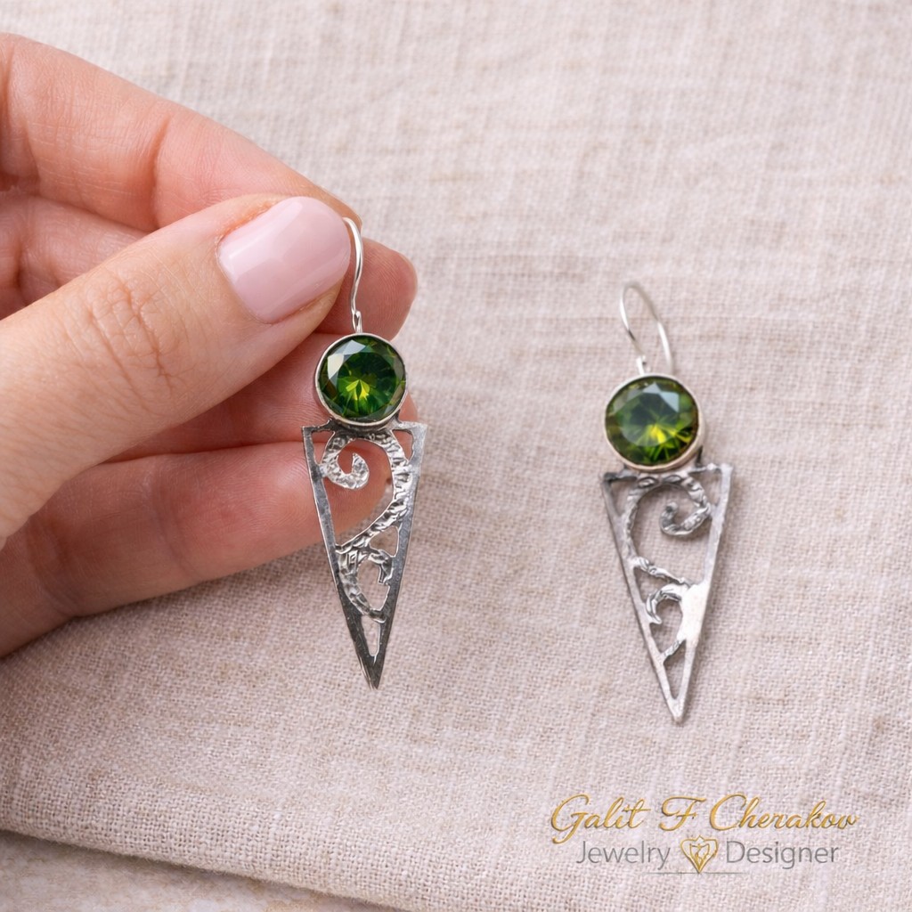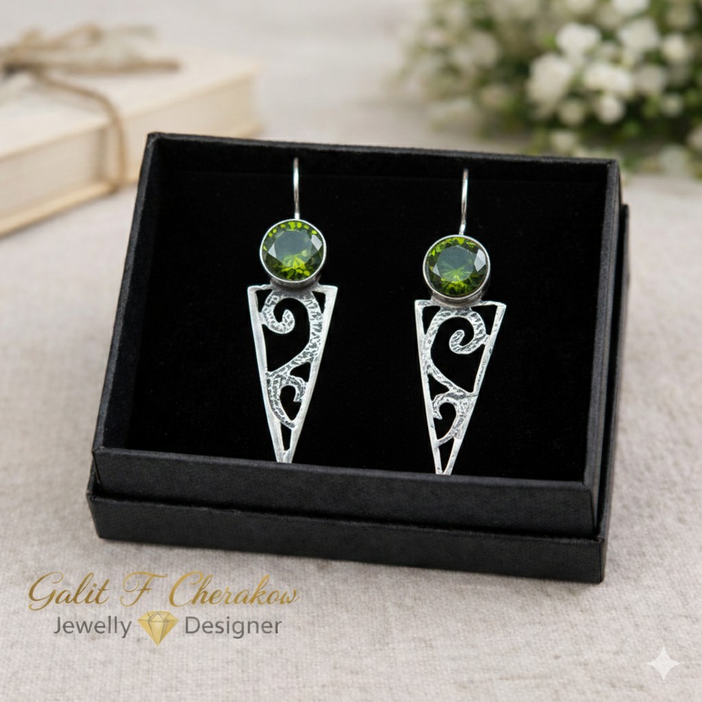 עגילים כסף 925 עבודת יד משובצים אבן ירוקה זירקון הם תכשיט מרהיב שיתן לך מראה מושלם ומושך את העין. העגילים עשויים מכסף איכותי בעל חומר יציבות מעולה, 925, המבטיח שהם יחזיקו לאורך זמן. כל עגיל מעוצב בעבודת יד יצירתית ומקפידה על פרטים מדויקים. העגילים משובצים באבן ירוקה זירקון, המספקת ברק וזוהר מדהימים. הם מתאימים לשימוש יומיומי או לאירועים מיוחדים ויתאימו לכל סגנון ומראה. העגילים האלגנטיים והייחודיים הללו הם מתנה מושלמת לעצמך או לאדם יקר בחייך. תוסיפי נצנוץ ויופי לכל הופעה עם עגילים אלו.