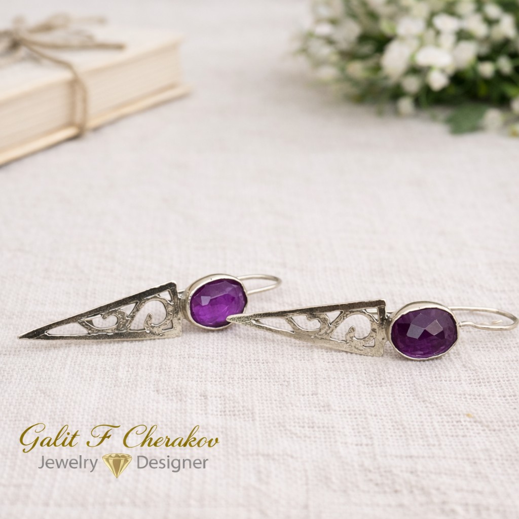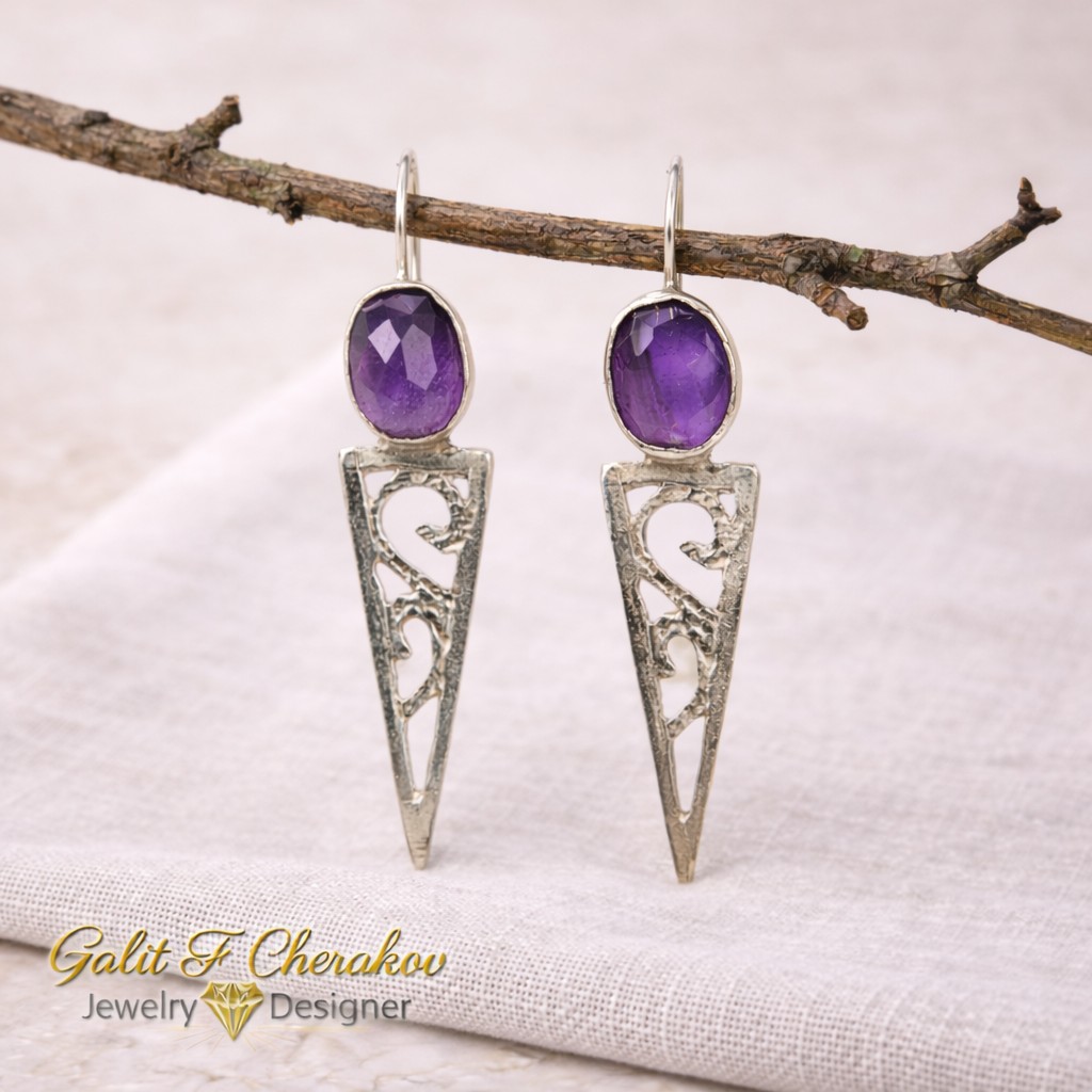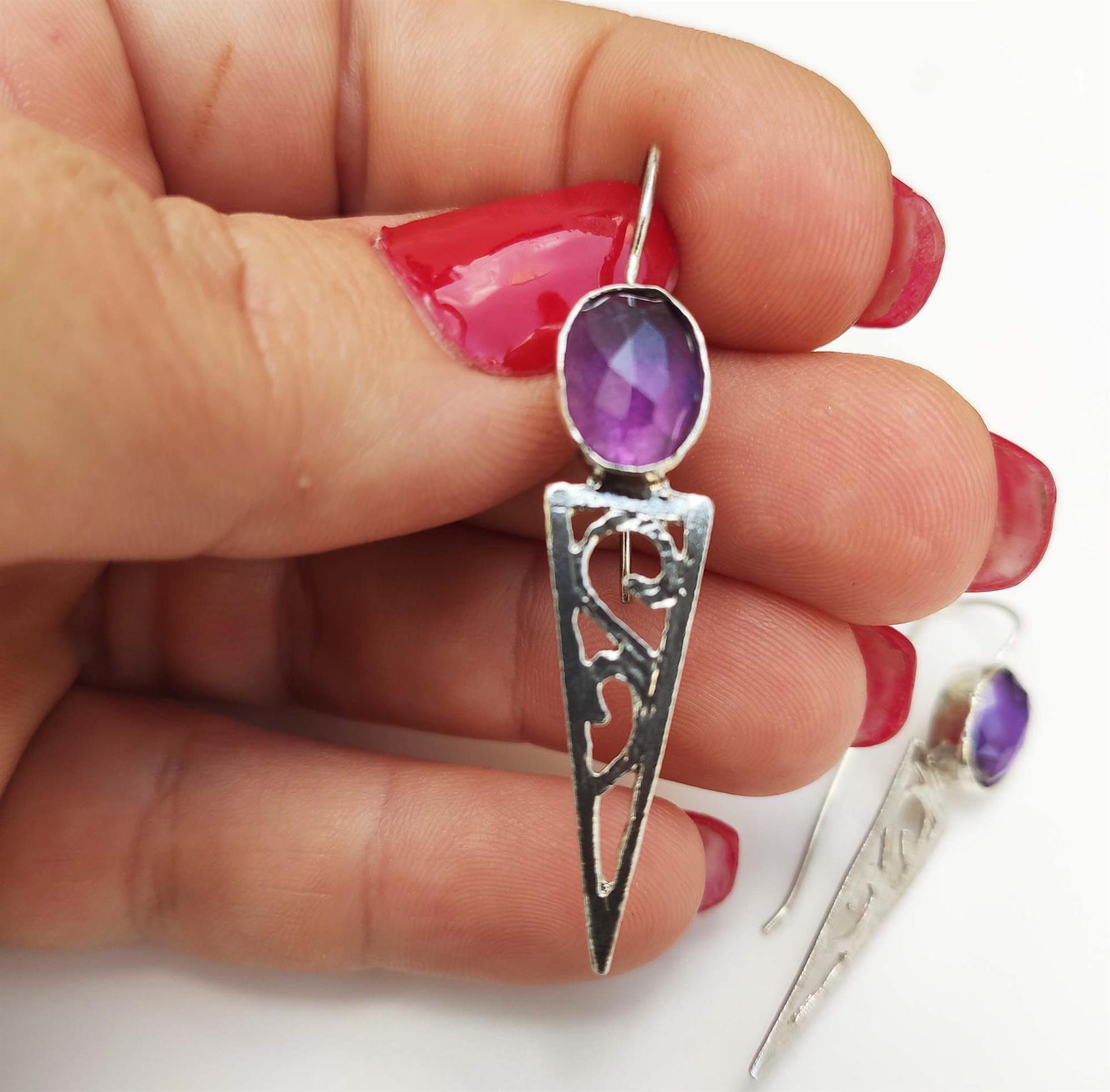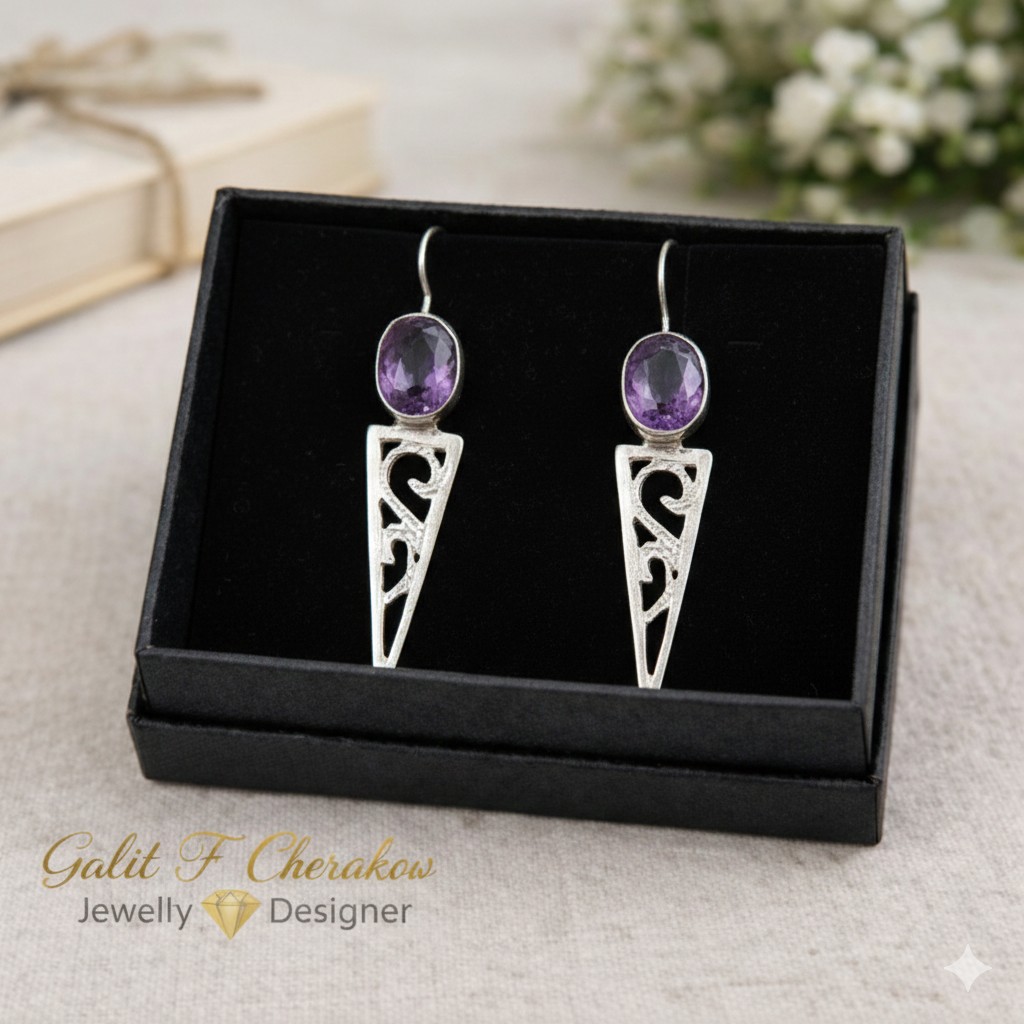 עגילים כסף 925 עבודת יד משובצים אבן סגולה אמטיסט הם תכשיט מרהיב שישדרג את כל לוק בסטייל ואופנה. העגילים עשויים מכסף 925 איכותי ועוצמתי, המבטיחים חיזוק ואמינות לאורך זמן. עבודת היד המקסימה מוסיפה פריט ייחודיות ואישיות לעגילים, מעניקה להם מראה מודרני ומושך.