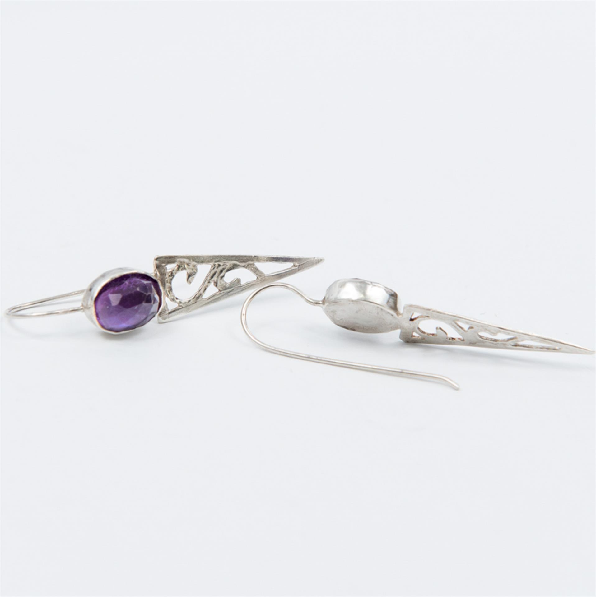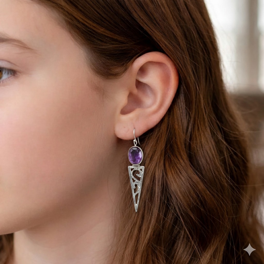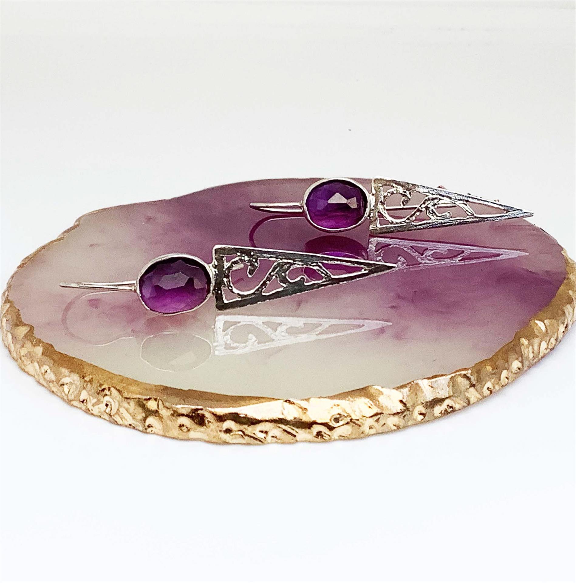 עגילים כסף 925 עבודת יד משובצים אבן סגולה אמטיסט הם תכשיט מרהיב שישדרג את כל לוק בסטייל ואופנה. העגילים עשויים מכסף 925 איכותי ועוצמתי, המבטיחים חיזוק ואמינות לאורך זמן. עבודת היד המקסימה מוסיפה פריט ייחודיות ואישיות לעגילים, מעניקה להם מראה מודרני ומושך.