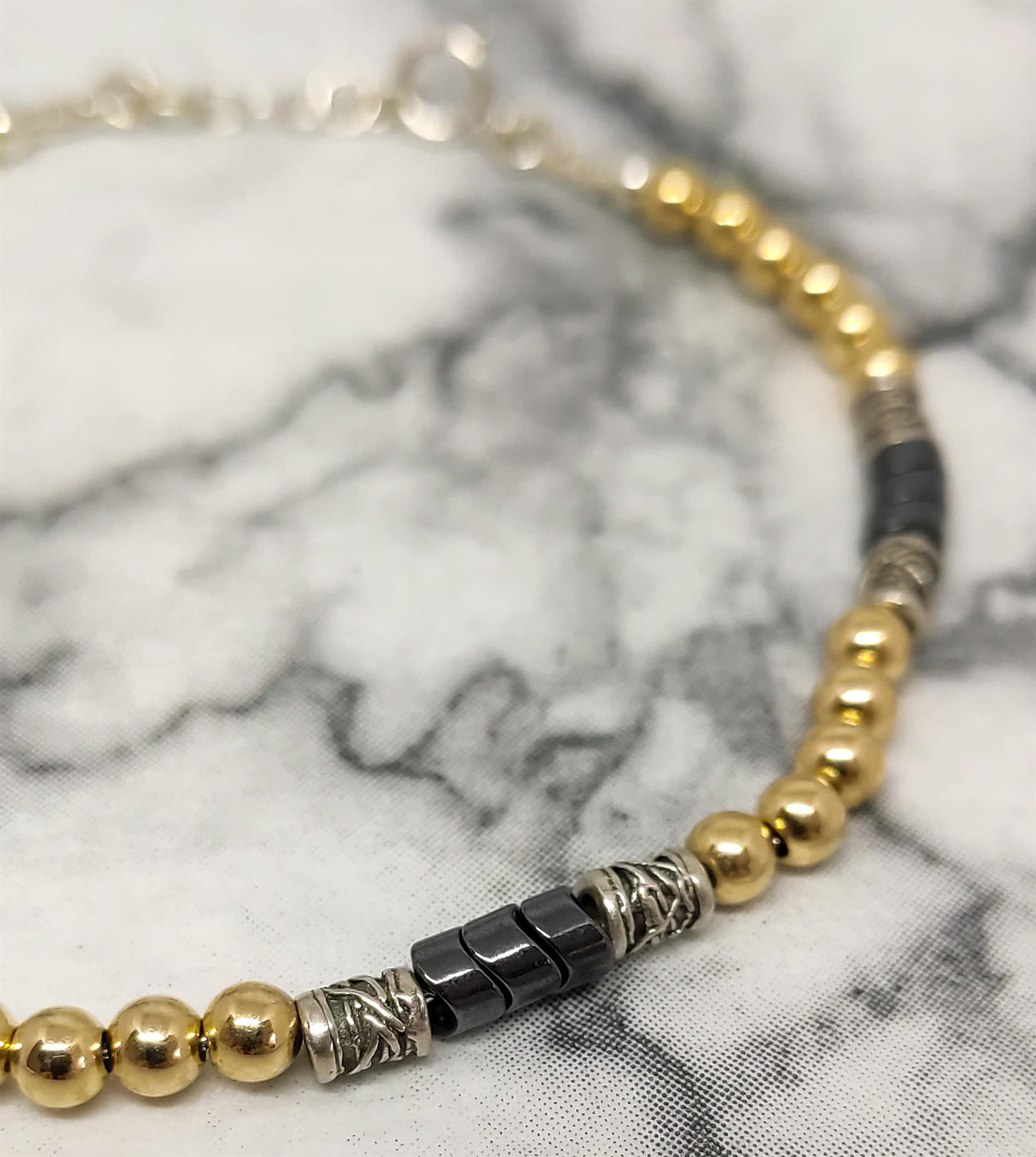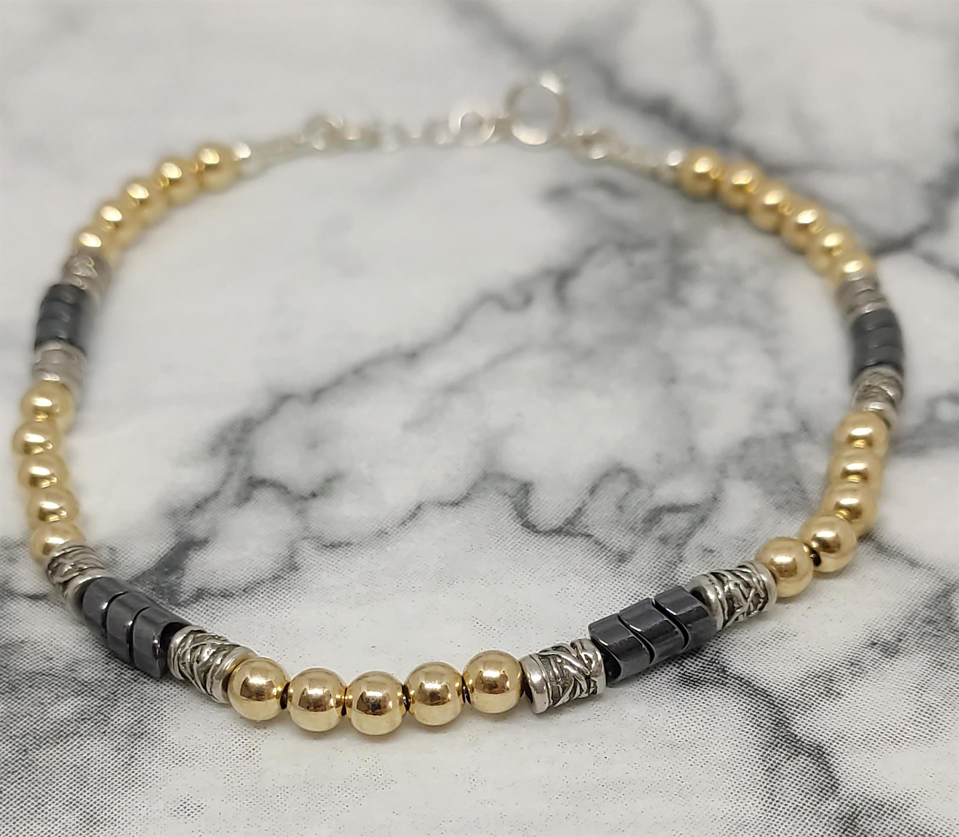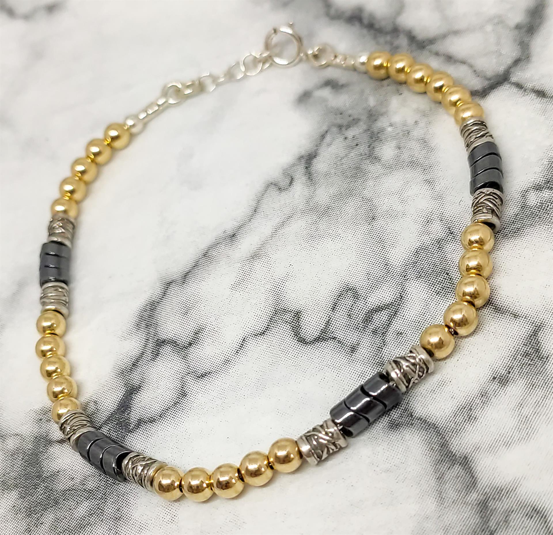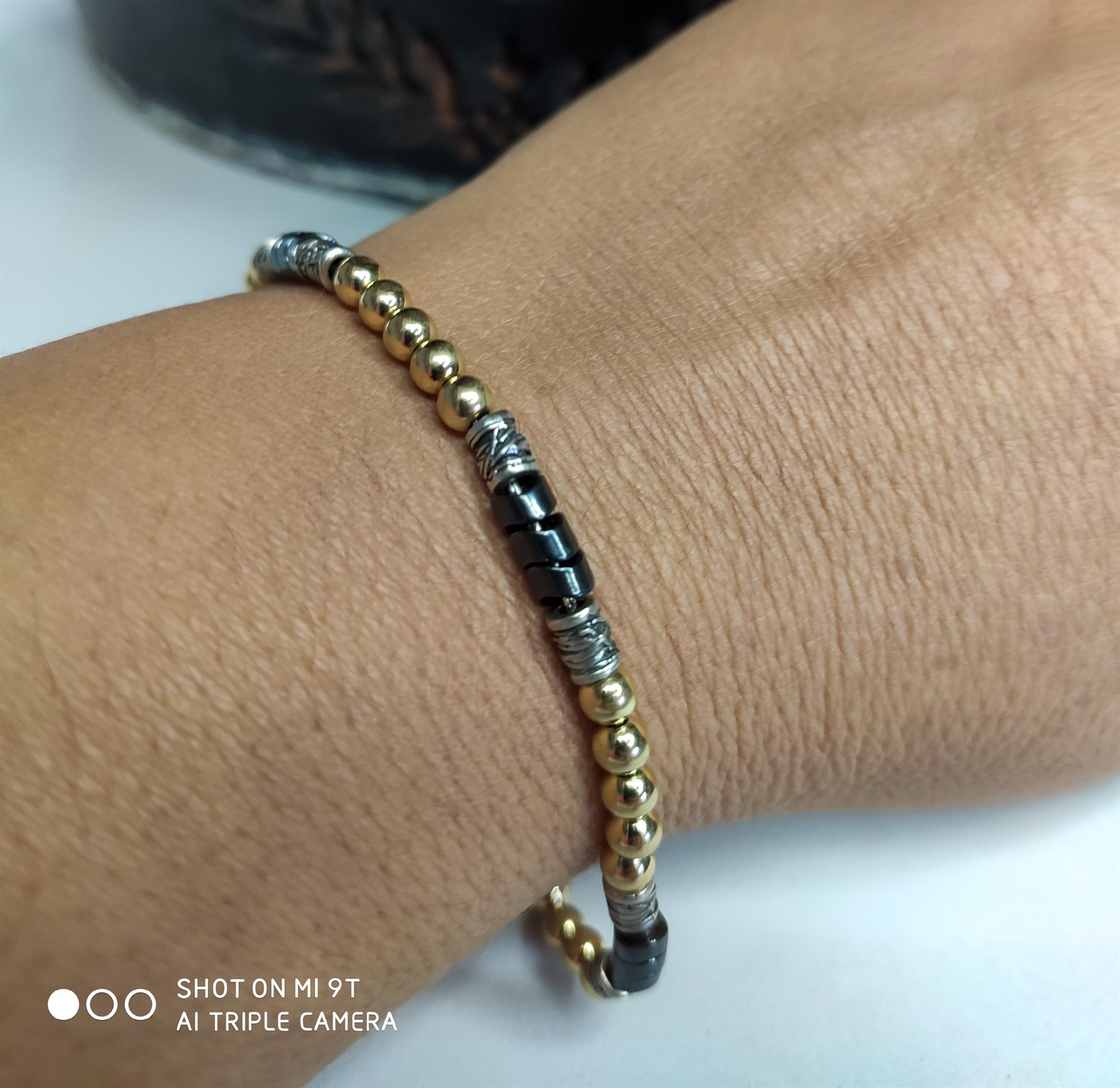צמיד זה הוא תכשיט הצהרה בעל מראה אלגנטי ומתוחכם. חרוזי הגולדפילד מוסיפים נופך יוקרתי וחמים, בעוד חרוזי הכסף המעוצבים מוסיפים עניין ויזואלי וייחודיות. השילוב עם חרוזי ההמטייט המטאליים מעניק טאץ' מודרני ומרתק.