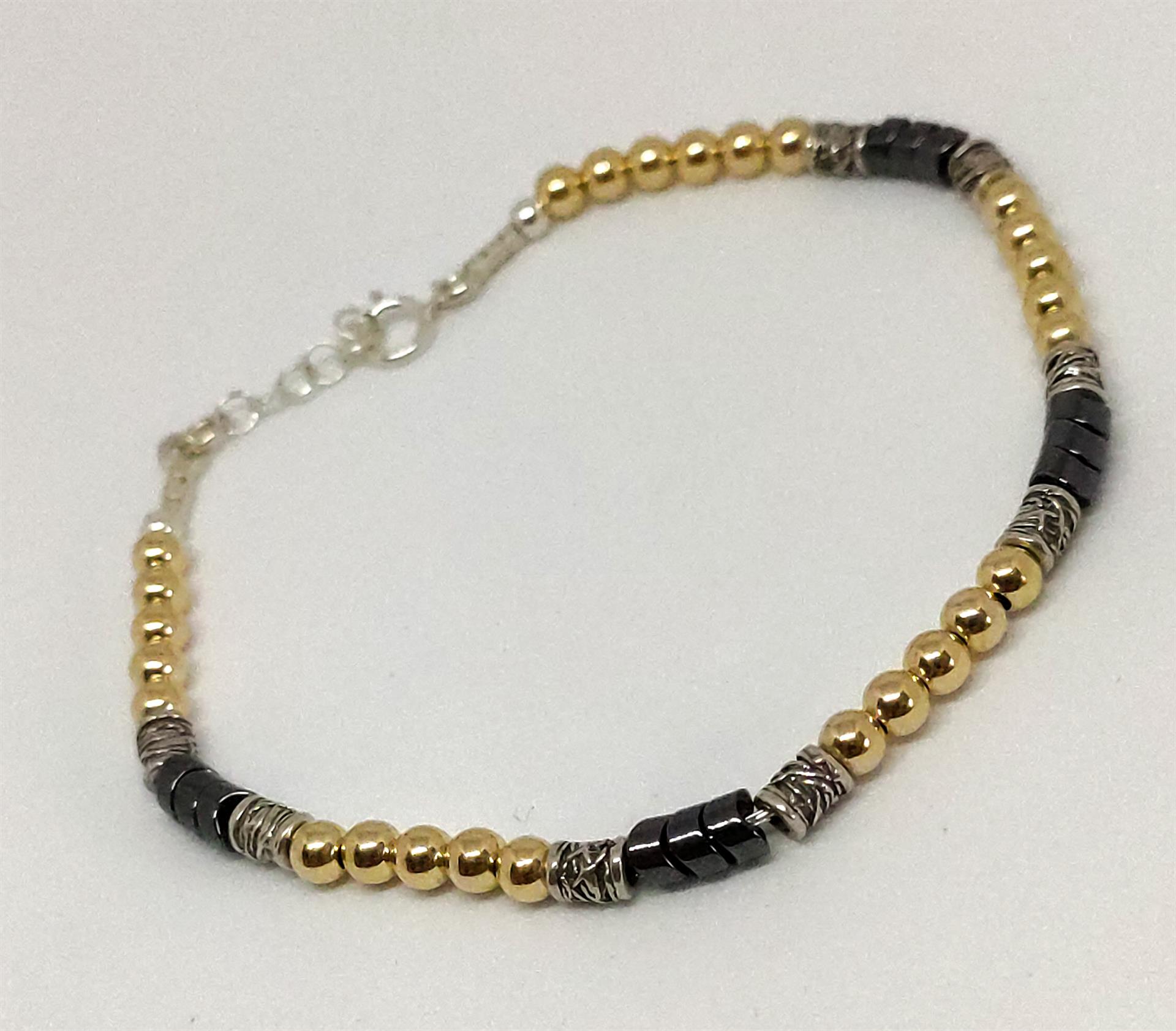גודל חרוזים: חרוזי הגולדפילד 4 מ"מ, צינוריות חרוזי הכסף, חרוזי ההמטייט 4 מ"מ