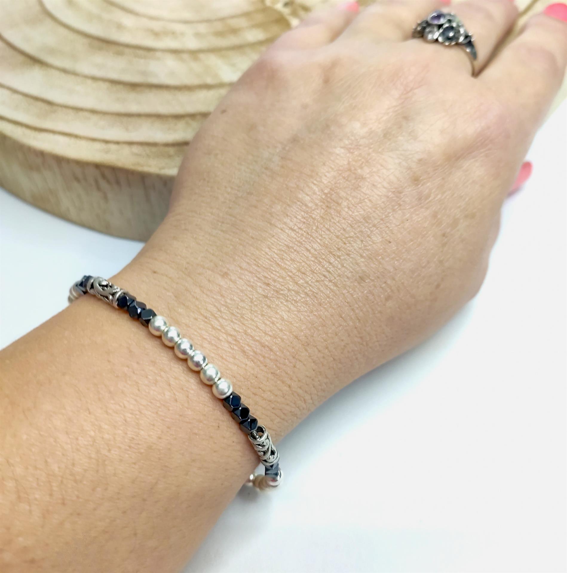 צמיד זה הוא תכשיט רב-תכליתי המתאים הן לגברים והן לנשים, ומעניק מראה אלגנטי ומודרני. השילוב ההרמוני בין הברק העדין של הכסף לגוון האפור העמוק והמטאלי של ההמטייט יוצר איזון מושלם וסטייל על-זמני.