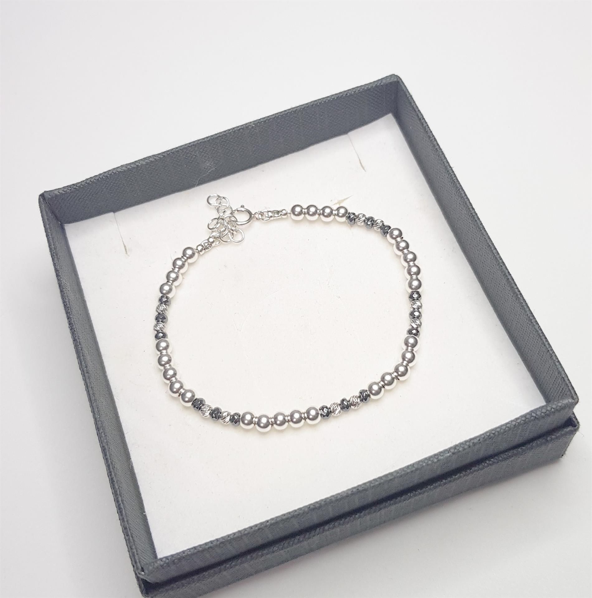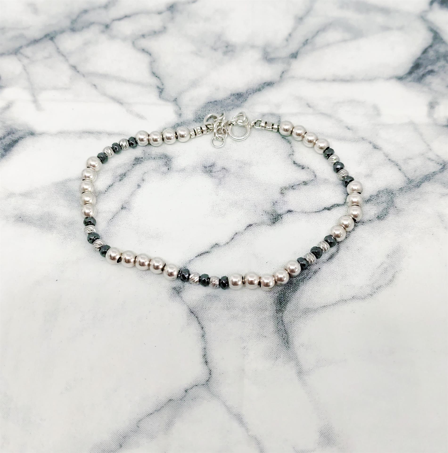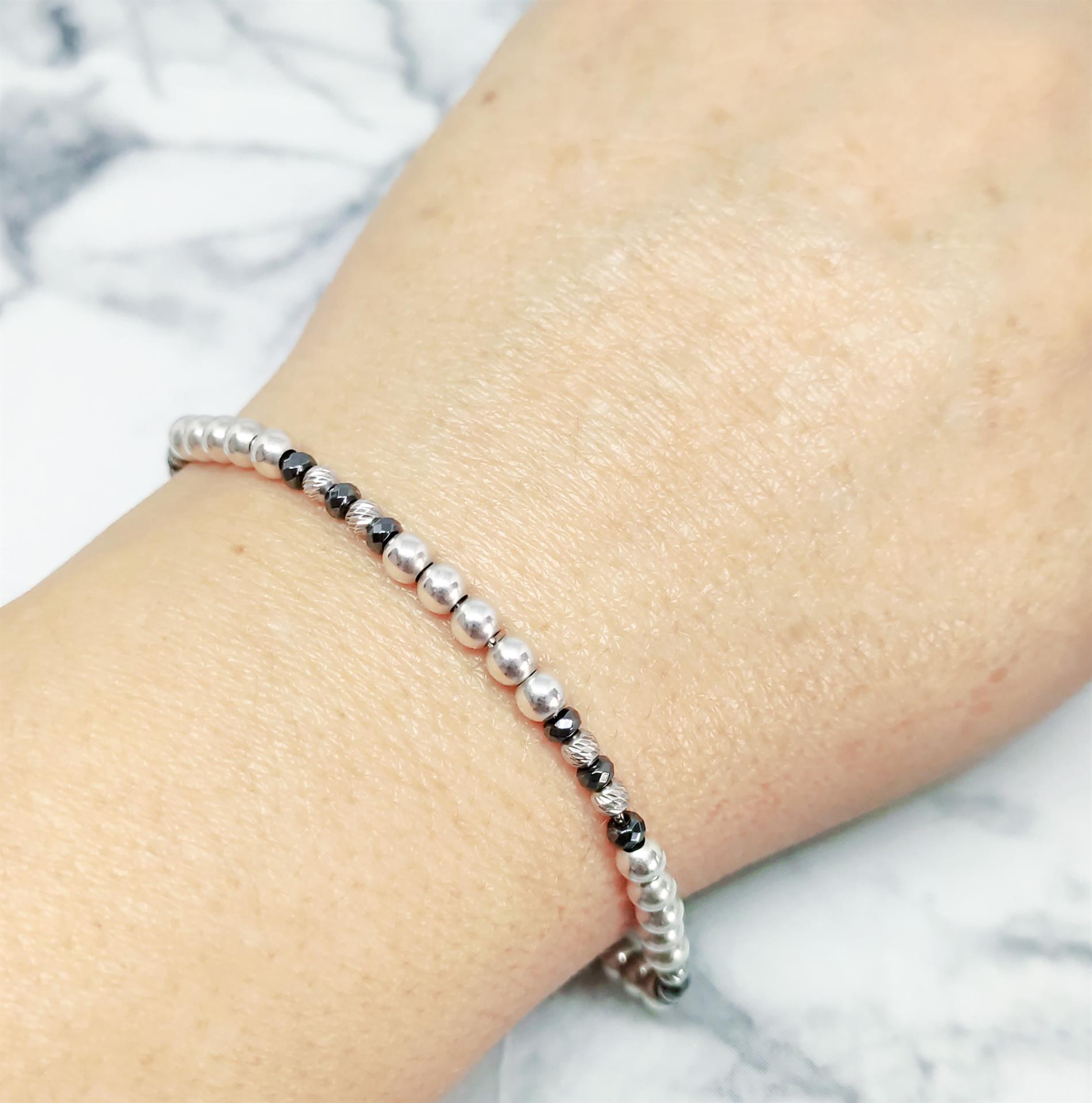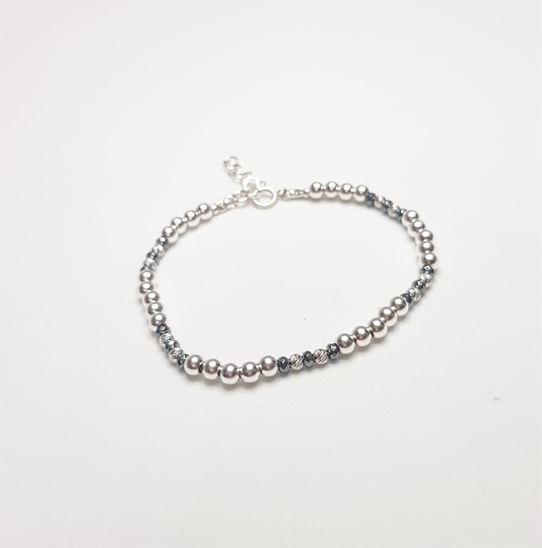 צמיד זה הוא תכשיט בעל מראה עכשווי ומרתק. חרוזי הכסף, שעוצבו בחיתוך לייזר מדויק, יוצרים דוגמאות גיאומטריות מעניינות ומוסיפים זוהר מיוחד. השילוב עם חרוזי ההמטייט המטאליים, בעלי הברק העמום והגוון האפור כהה, יוצר ניגוד אלגנטי ומודרני.