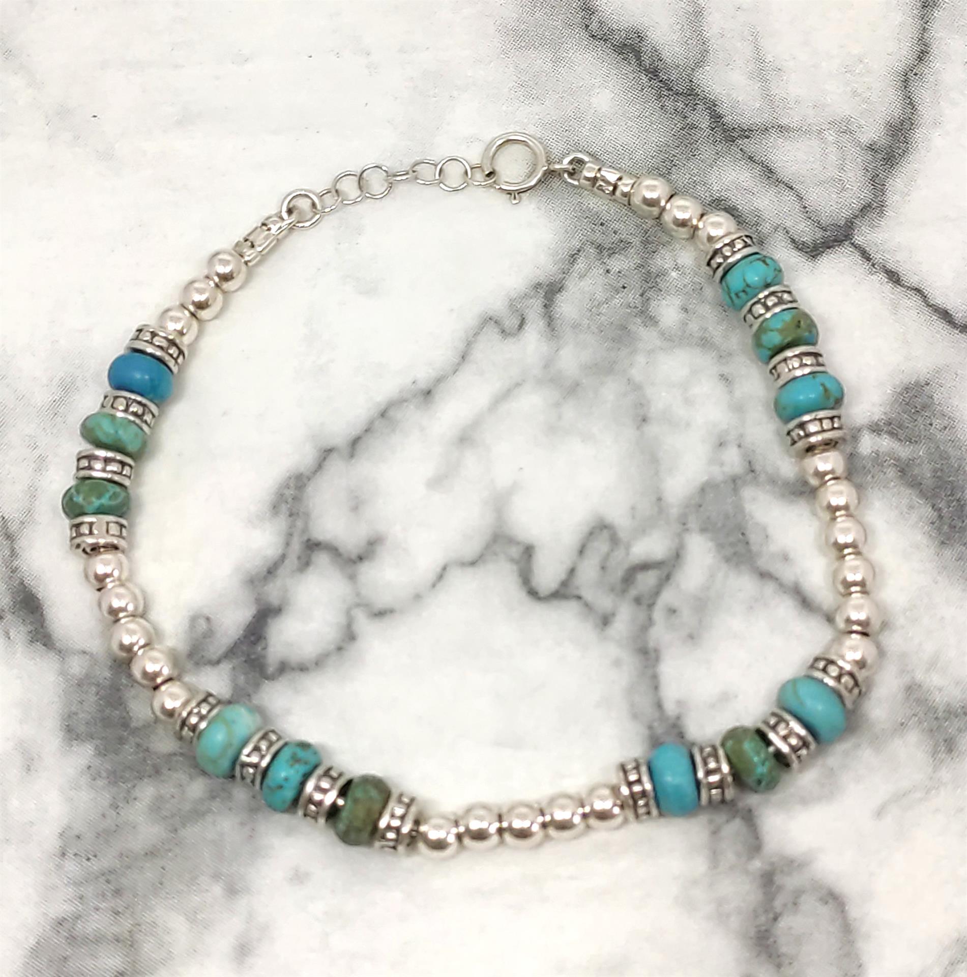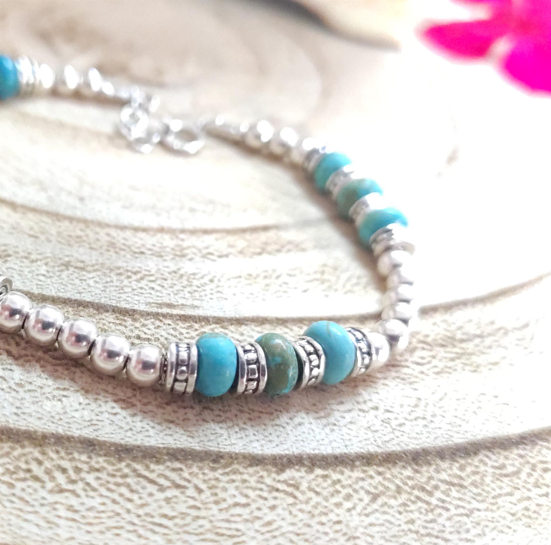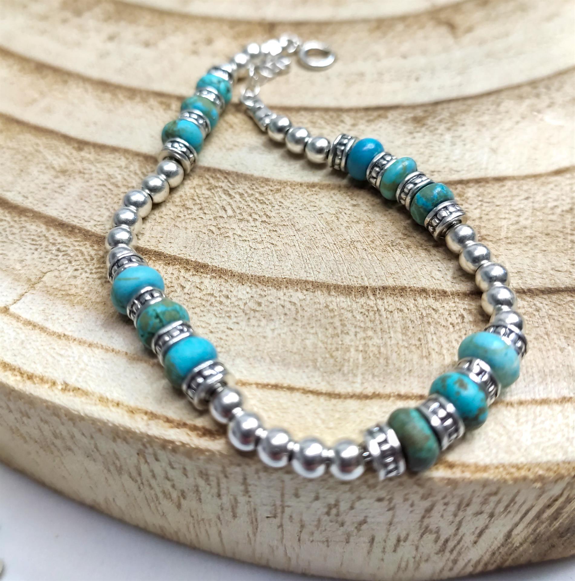 צמיד זה הוא תכשיט הצהרה המשלב את הברק העשיר של הכסף עם היופי הייחודי והמרגיע של אבן הטורקיז. גודל חרוזי הכסף והטורקיז יוצרים יחד מראה מרשים ומושך את העין, בעוד השילוב הטבעי של הצבעים מעניק תחושה של חופש ואלגנטיות בוהמיינית.