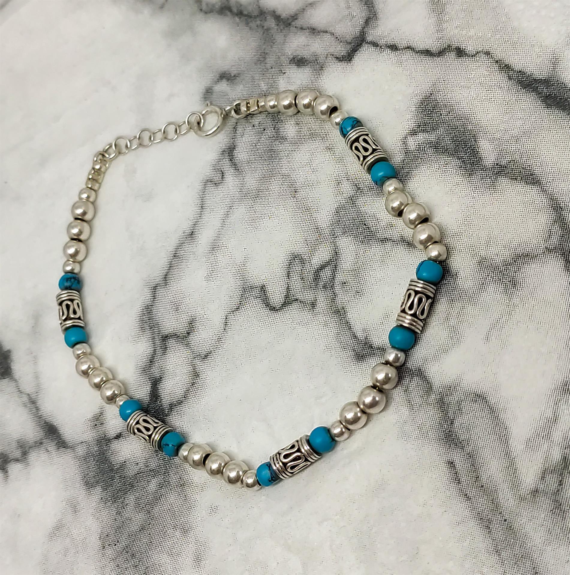 צמיד זה הוא תכשיט הצהרה המשלב את הברק העשיר של הכסף עם היופי הייחודי והמרגיע של אבן הטורקיז. גודל חרוזי הכסף והטורקיז יוצרים יחד מראה מרשים ומושך את העין, בעוד השילוב הטבעי של הצבעים מעניק תחושה של חופש ואלגנטיות בוהמיינית.