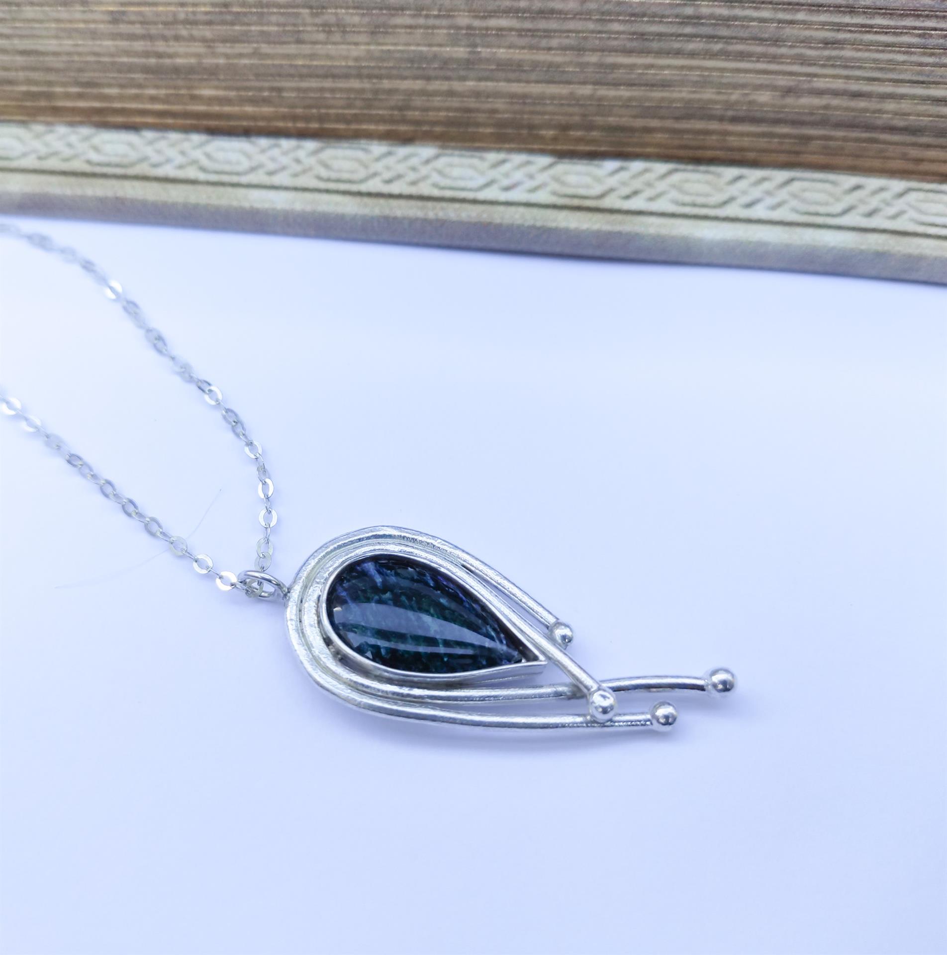 שרשרת זו היא תכשיט המשלב את הברק הקלאסי של הכסף עם היופי הטבעי והמרגיע של הצבע הירוק והמרקם הייחודי של הצדף. צורת הטיפה הנצחית משדרת אלגנטיות ורכות, בעוד האבן הירוקה העשויה צדף מוסיפה נגיעה של רעננות וקסם טבעי.