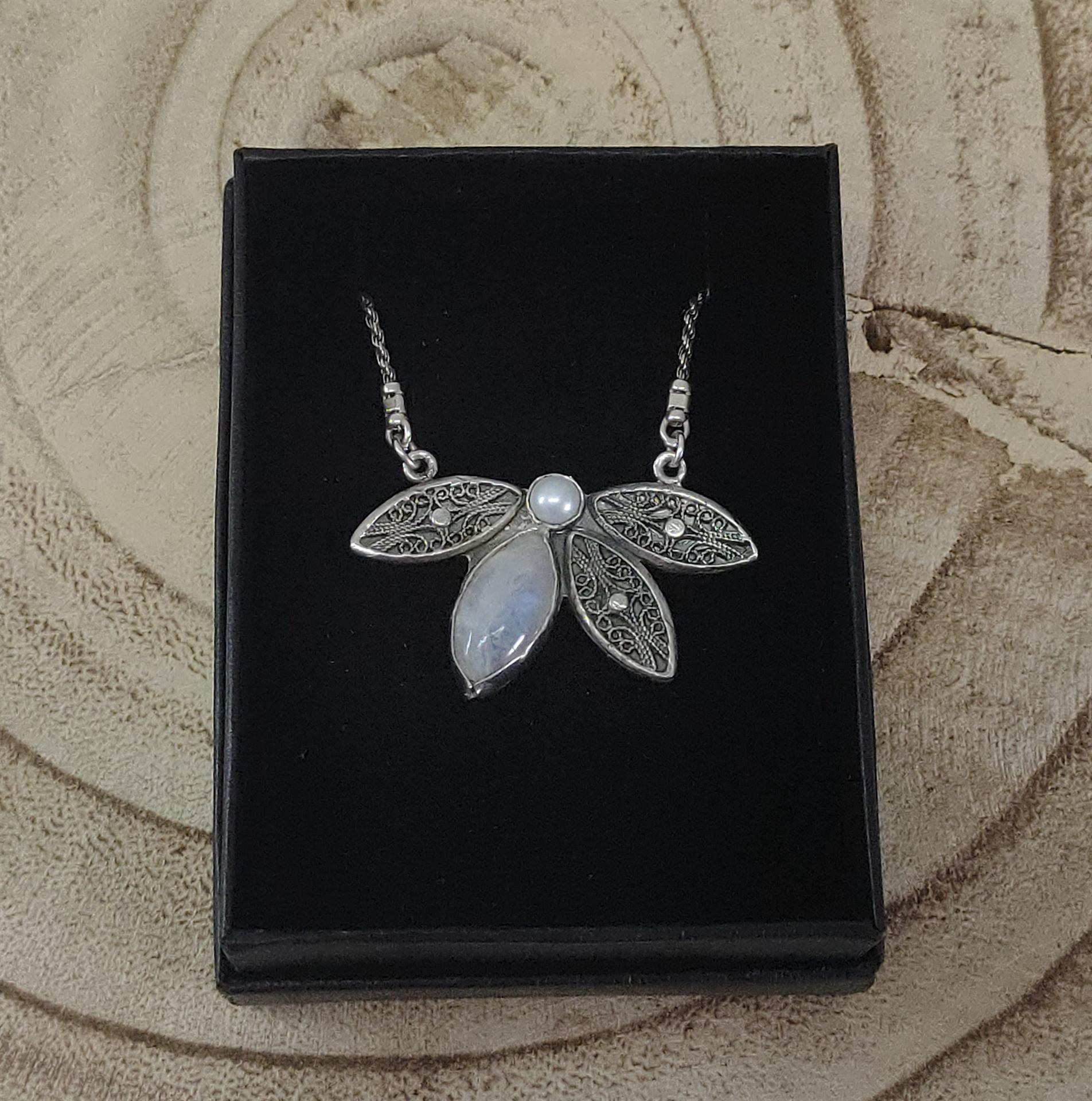 • חומרים: כסף סטרלינג 925, פנינה טבעית, אבן מון סטון