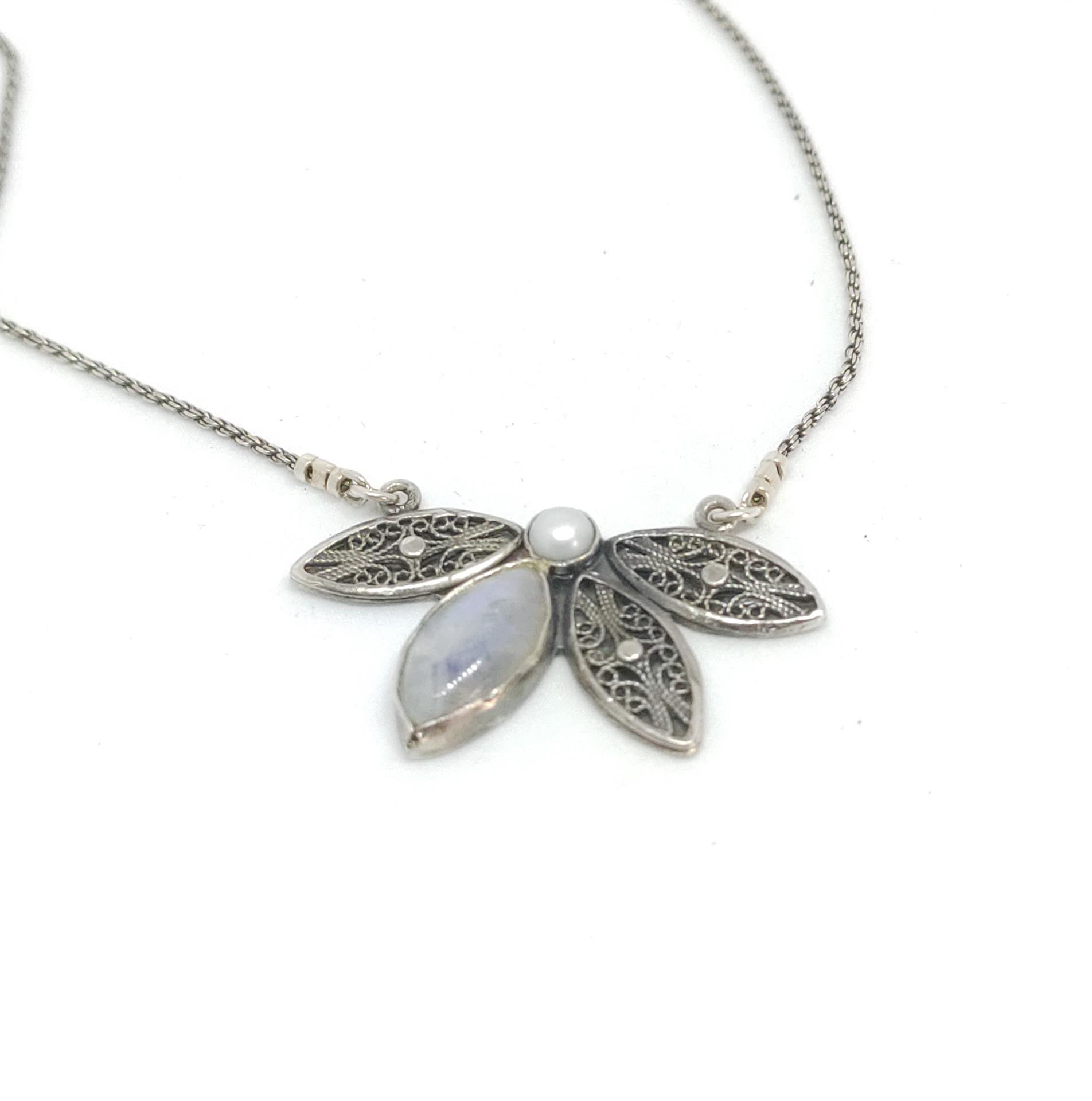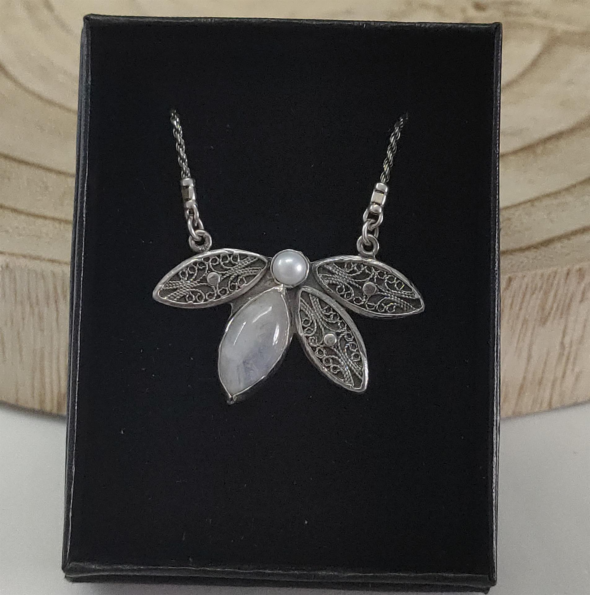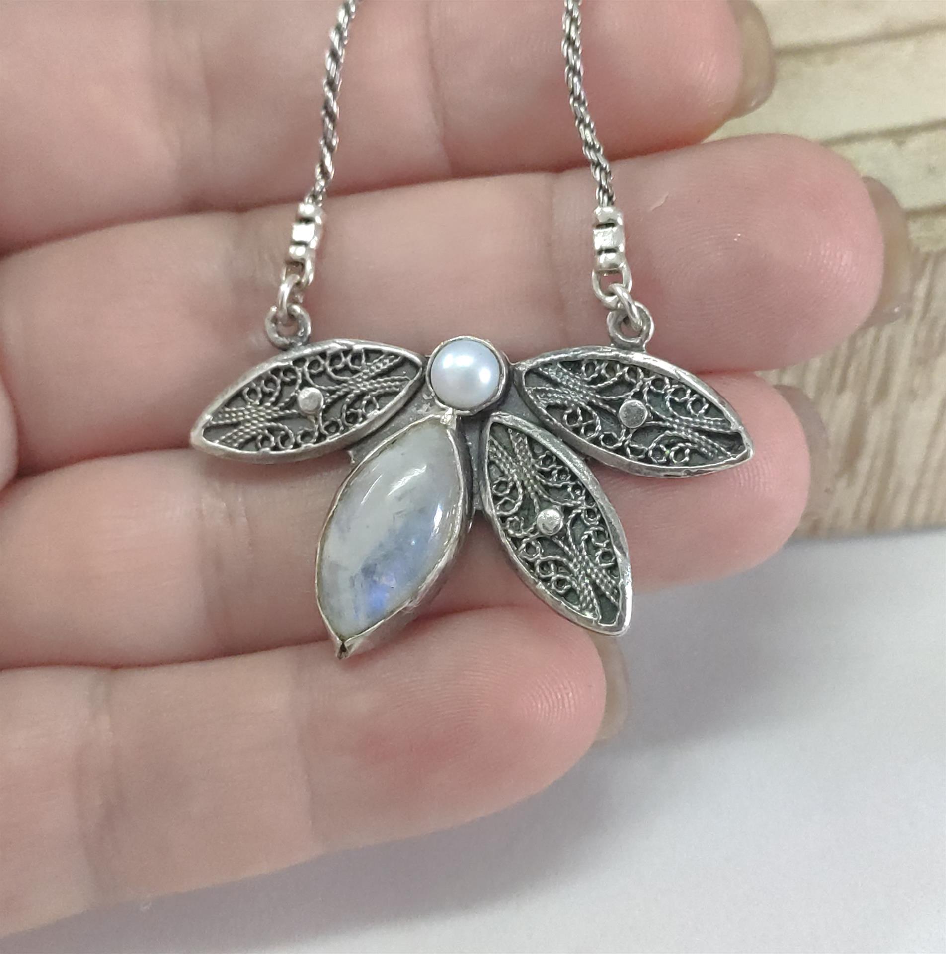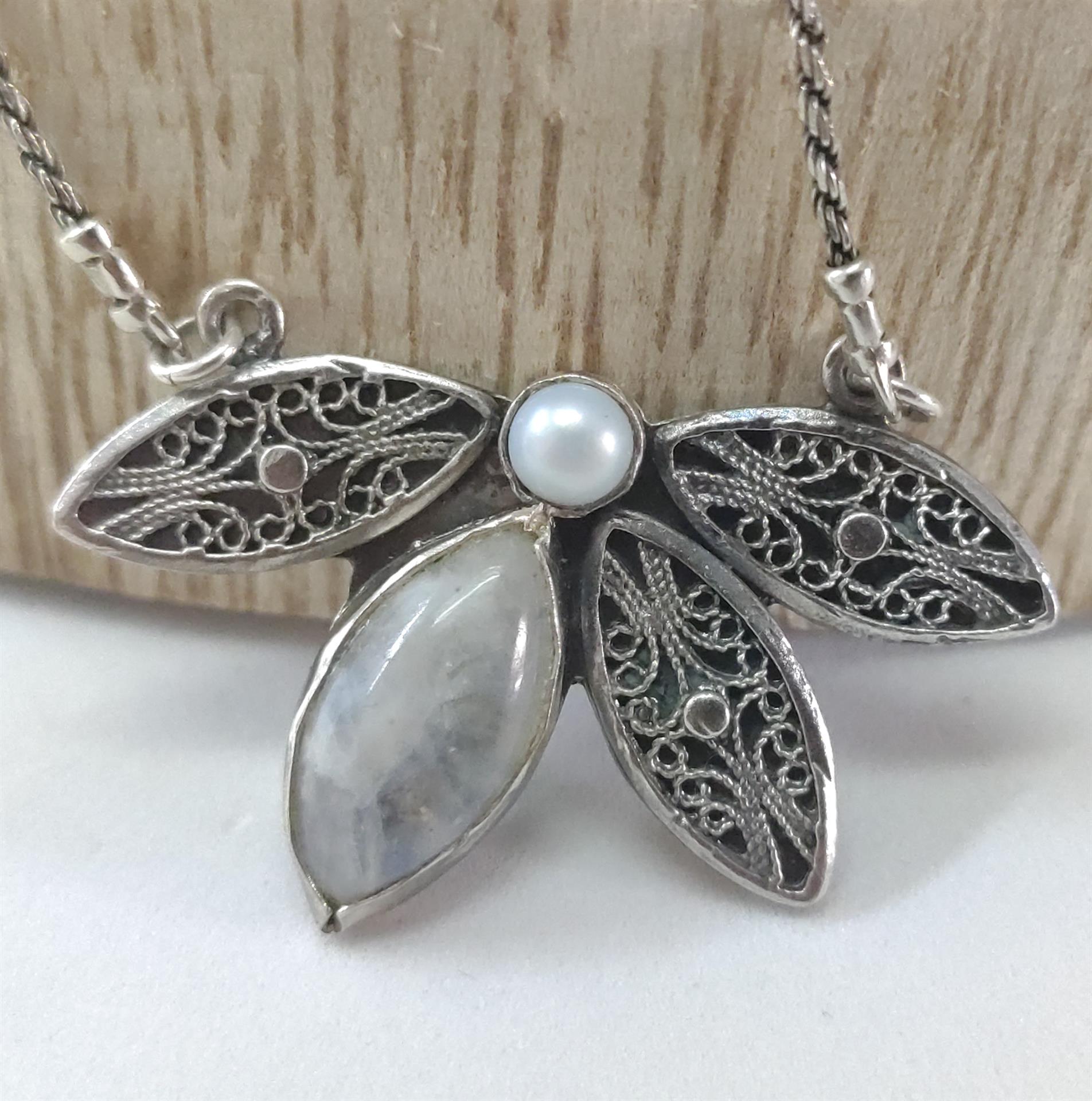 • תליון: מעוצב ייחודי משולב פנינה ואבן מון סטון עם פרטי פיליגרן