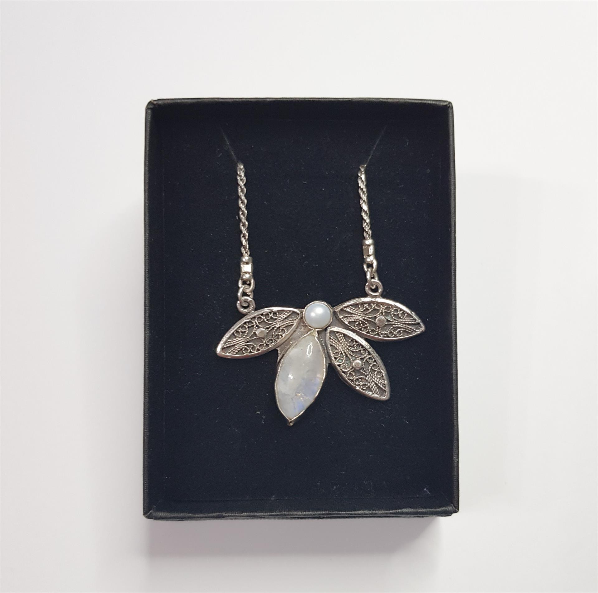 שרשרת זו היא תכשיט מלא קסם ורוך, המשלב את הברק העדין של הכסף עם זוהר הפנינה הקלאסי, הבוהק הרך והמשתנה של אבן המון סטון, ופרטי תחרה עדינים של פיליגרן. עבודת היד המוקפדת ניכרת בכל פרט, ויוצרת תכשיט בעל אופי ייחודי וקסם נצחי.