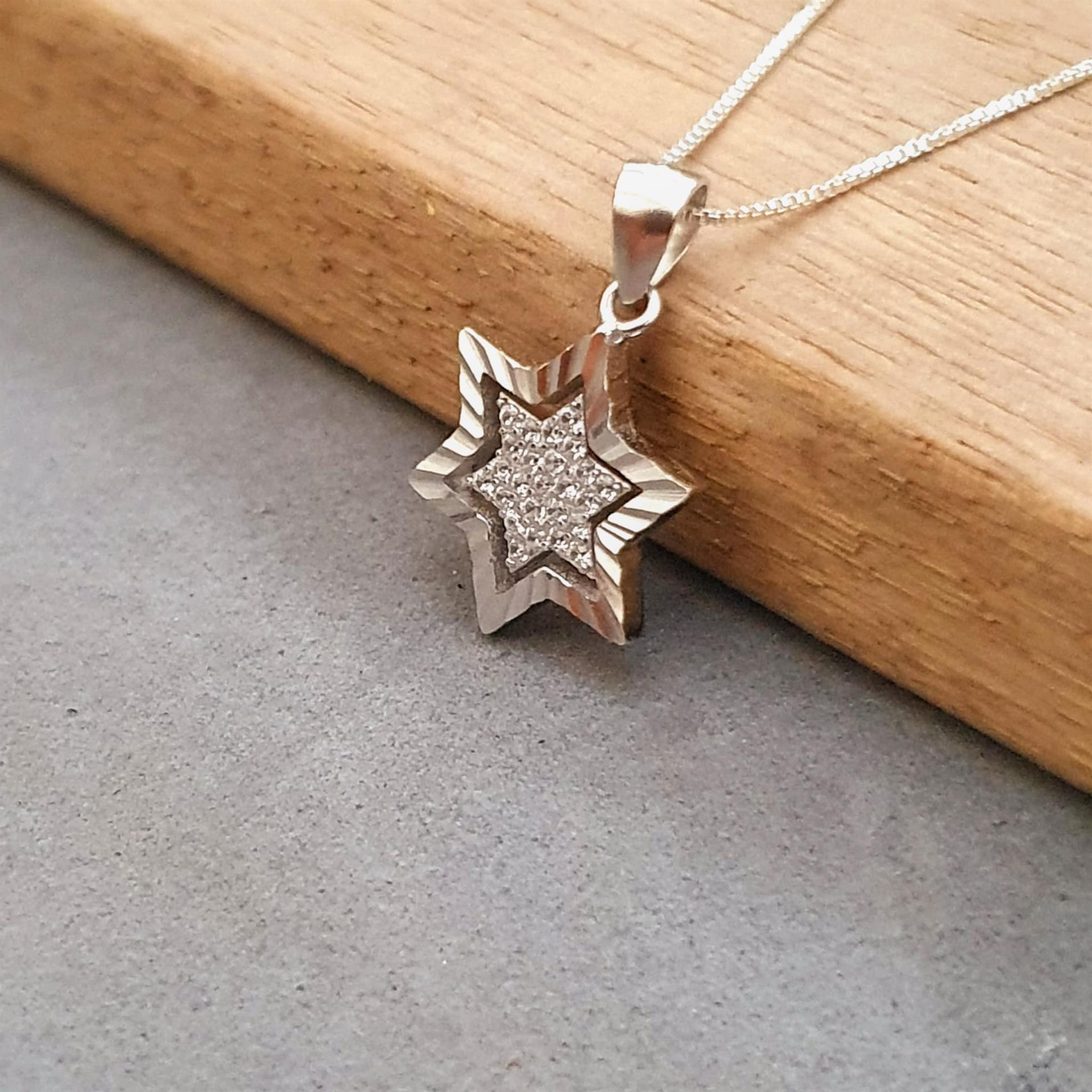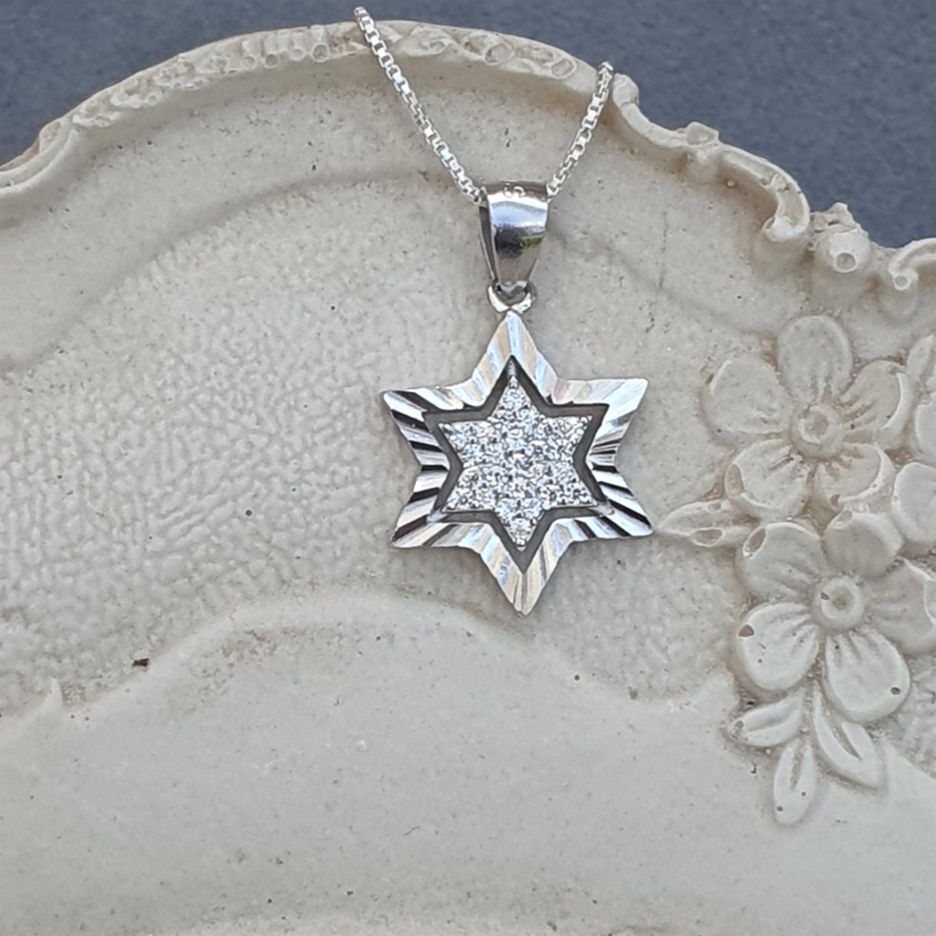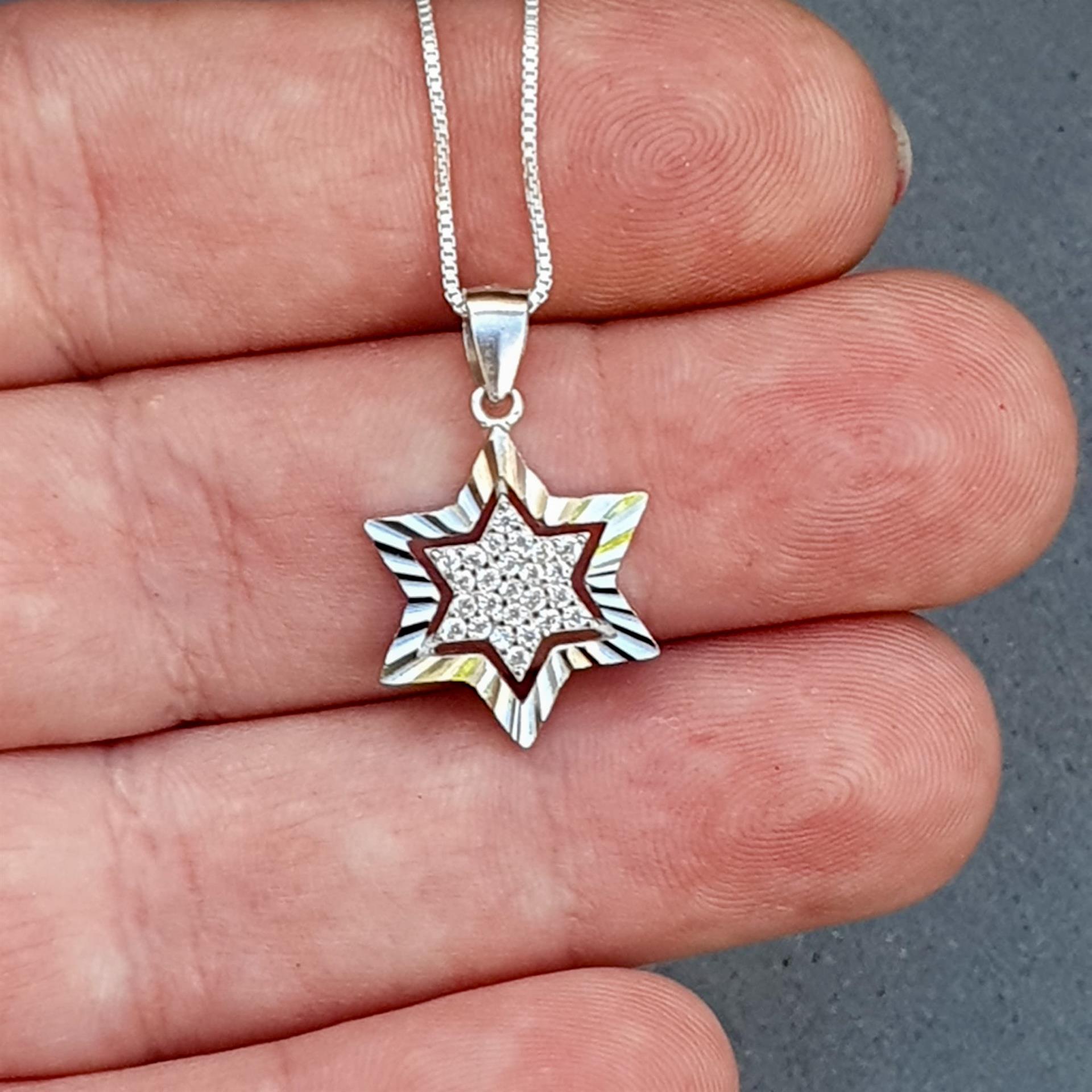 שרשרת זו משלבת את הסמל היהודי העתיק והמשמעותי של מגן דוד עם נגיעות זוהר עדינות של אבני זירקון איכותיות. גודל התליון הקטן והשיבוץ המינימליסטי יוצרים יחד מראה אלגנטי וקלאסי, המתאים ללבישה יומיומית או לאירועים מיוחדים.