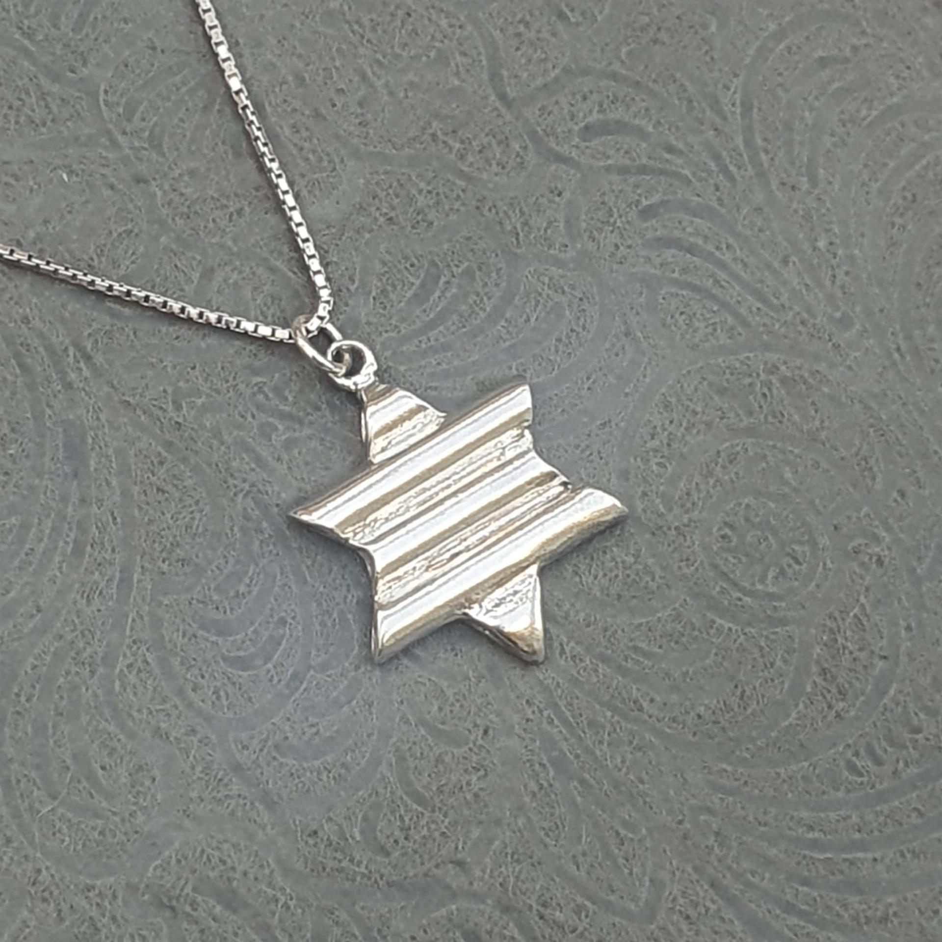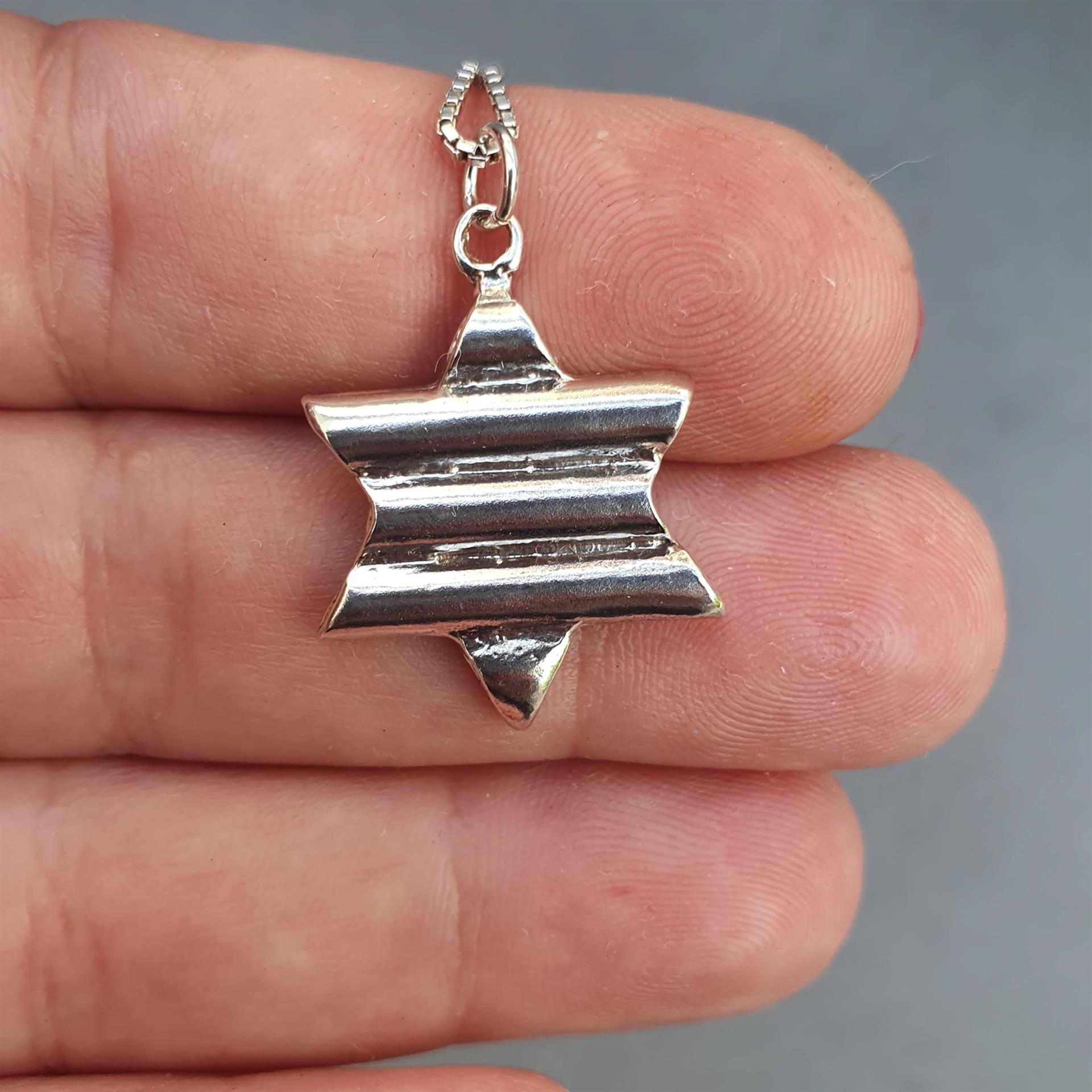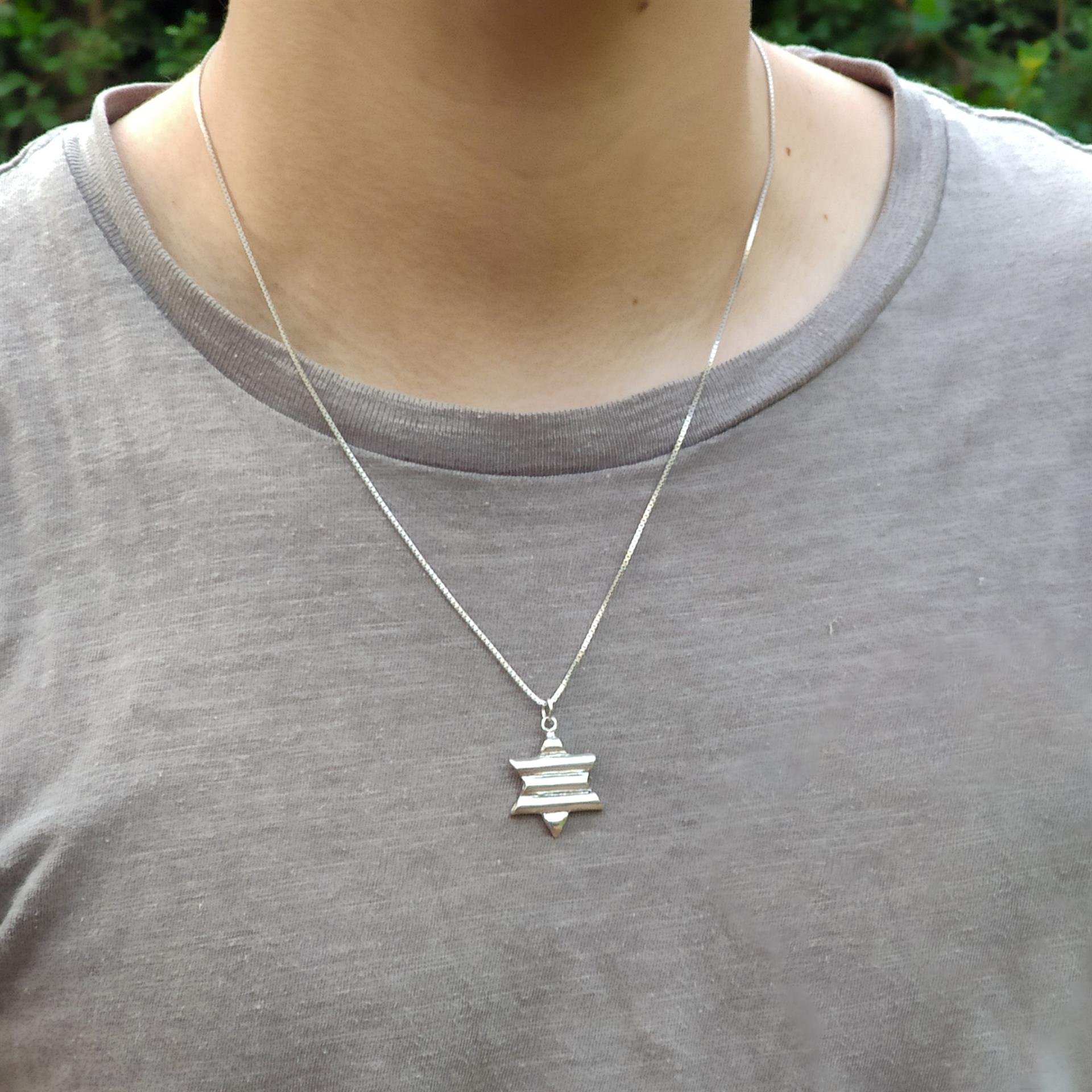 שרשרת זו משלבת את הסמל היהודי העתיק והמשמעותי של מגן דוד עם טוויסט עיצובי מודרני. הפסים המובנים בתליון הכסף מוסיפים עניין ויזואלי וייחודיות, תוך שמירה על האלגנטיות והמשמעות העמוקה של הסמל.