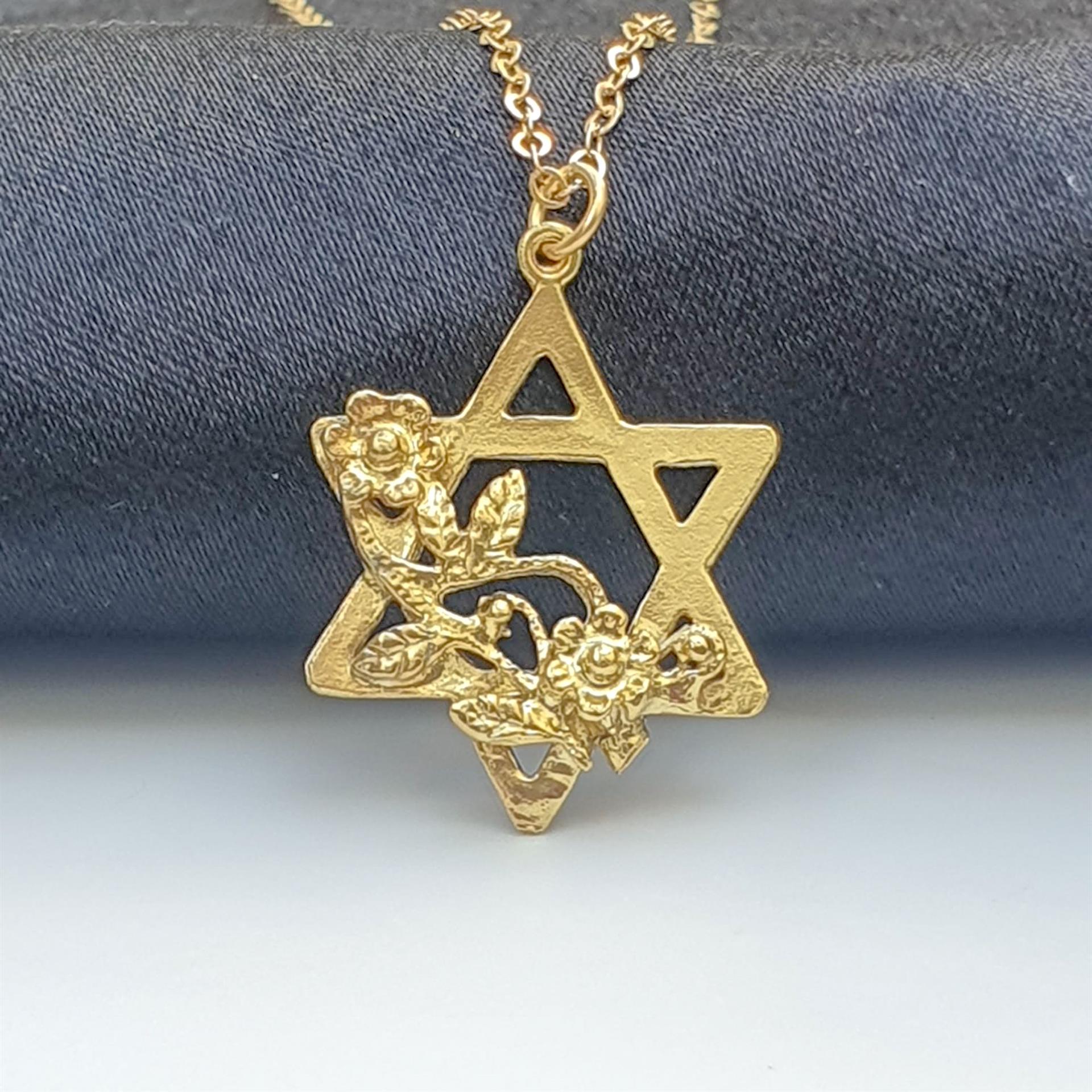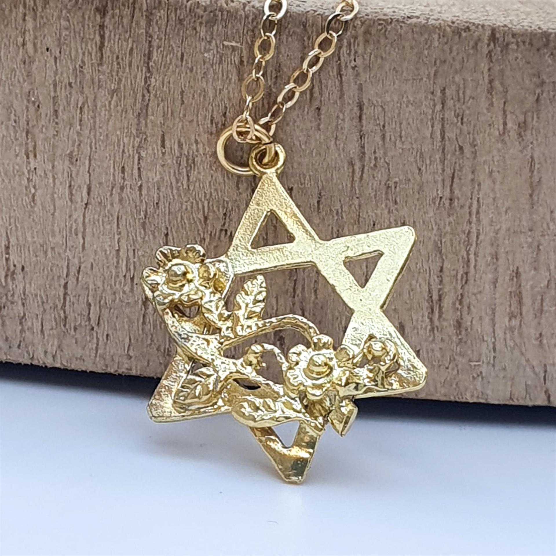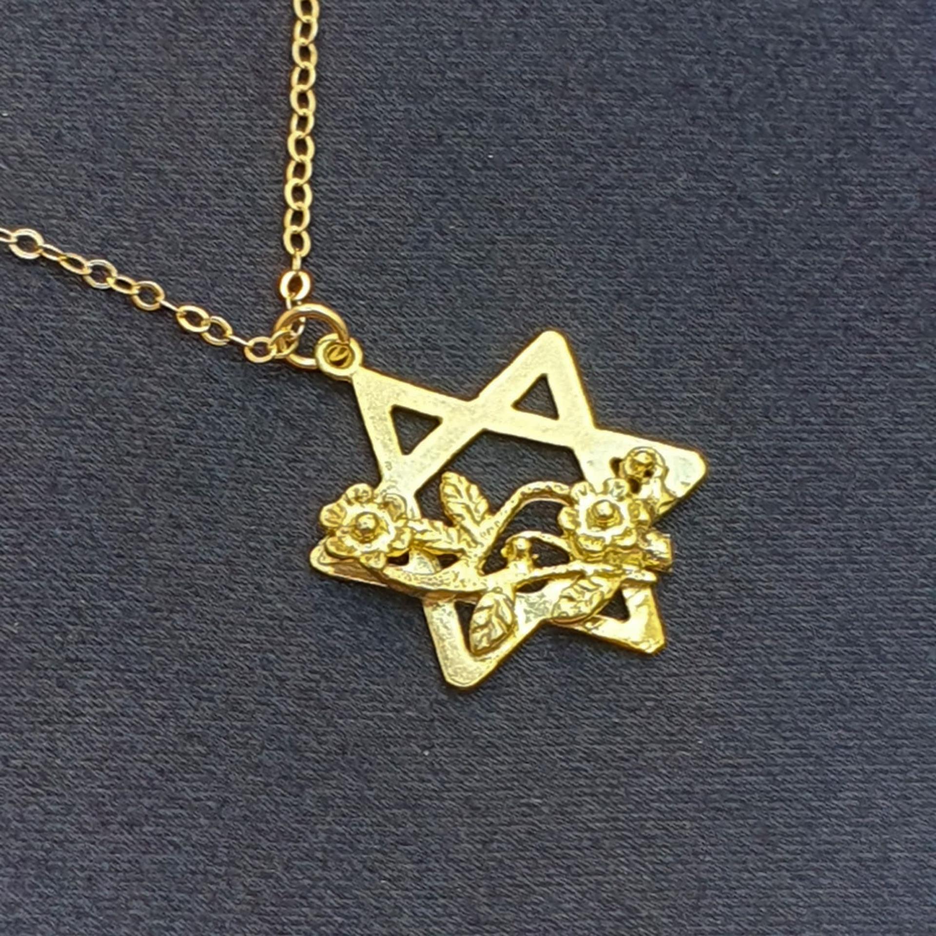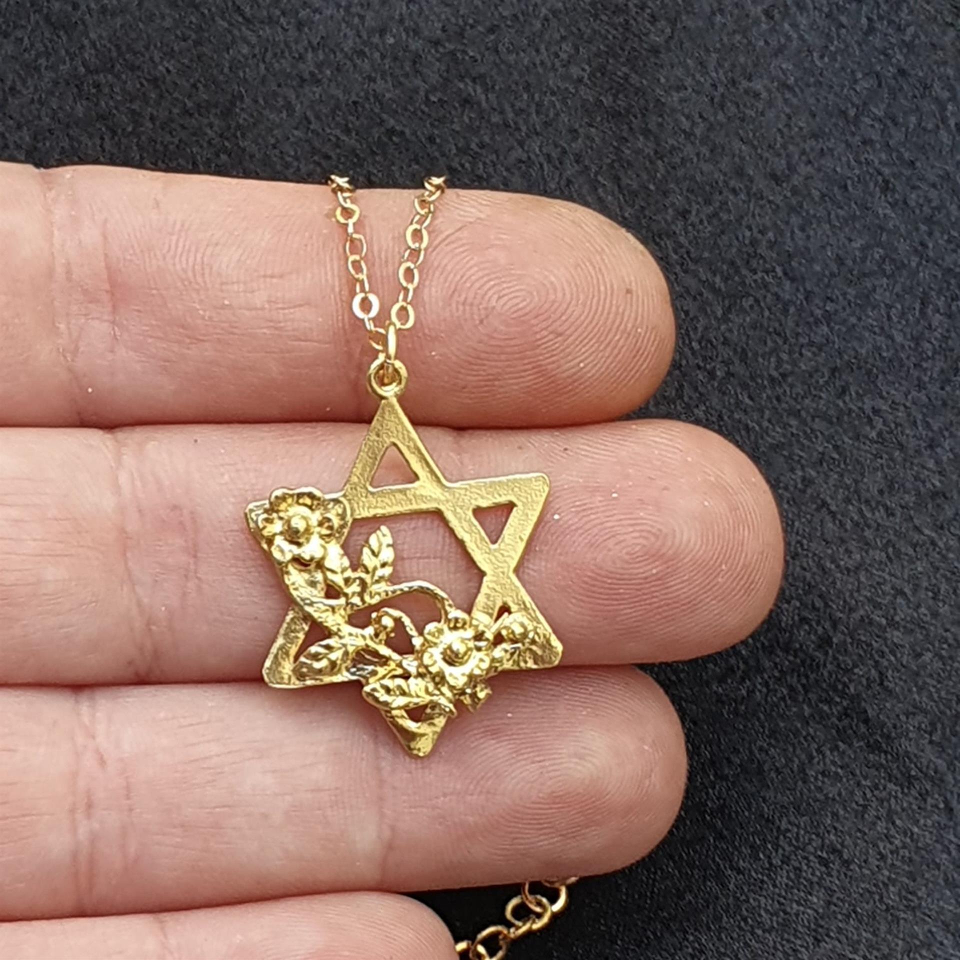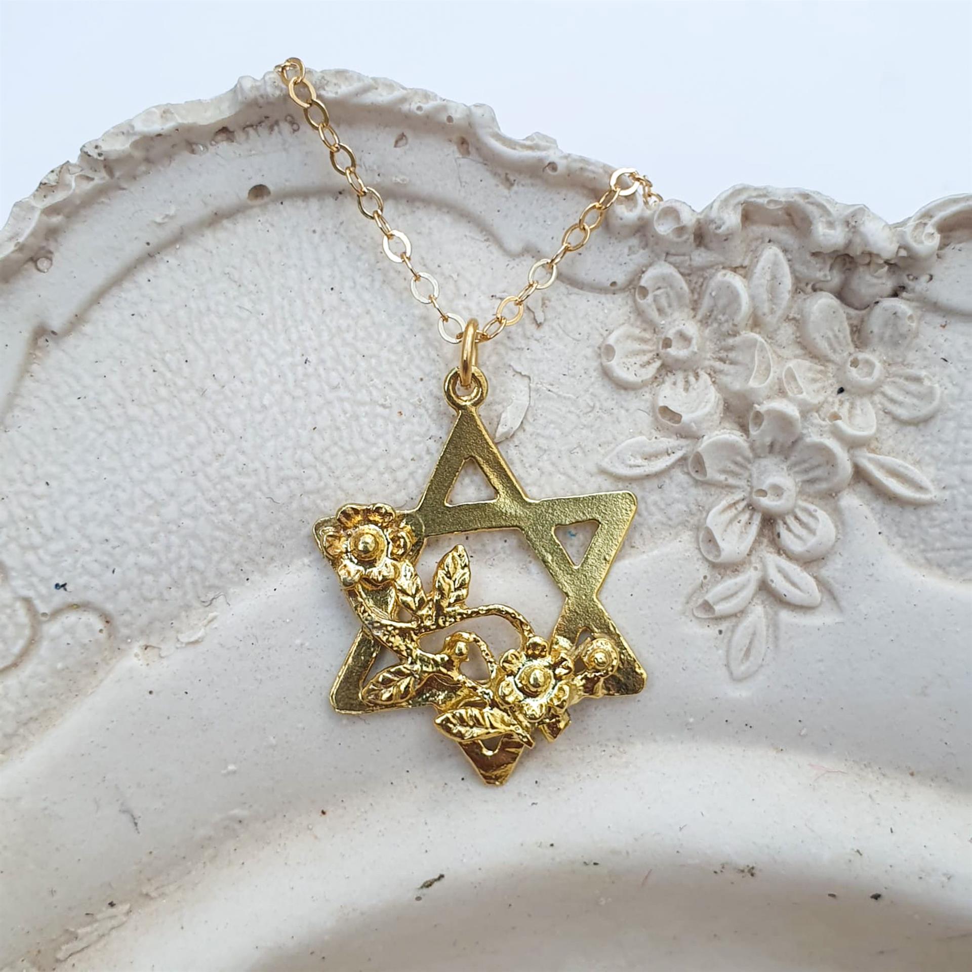 שרשרת זו משלבת את הסמל היהודי העתיק והמשמעותי של מגן דוד עם אלמנטים עיצוביים רכים וחיים של פרחים. הזהב 14 קראט מעניק זוהר חמים ועשיר, בעוד שילוב הפרחים העדינים מוסיף נופך ייחודי, אופטימי ורומנטי לסמל הנצחי.