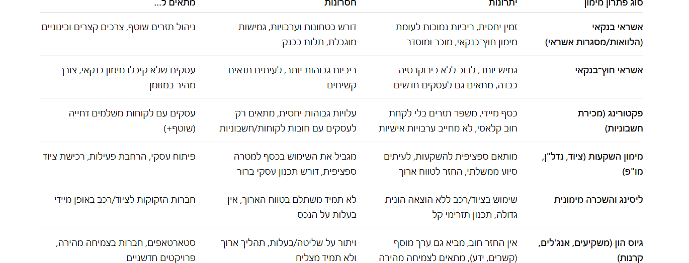 אשראי בנקאי קלאסי – הלוואות, קווי אשראי, מסגרות עו"ש. מתאים בעיקר לניהול שוטף, אבל לרוב מלווה בריביות ובדרישות בטחונות.